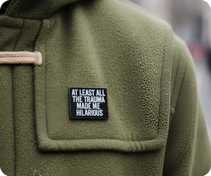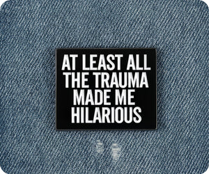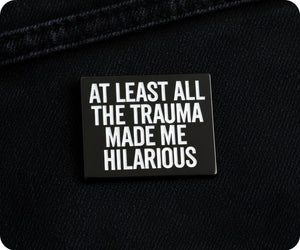 Turn your traumatic experiences into humor with the At Least All The Trauma Made Me Hilarious Pin Badge. Wear it proudly and let the laughs begin!