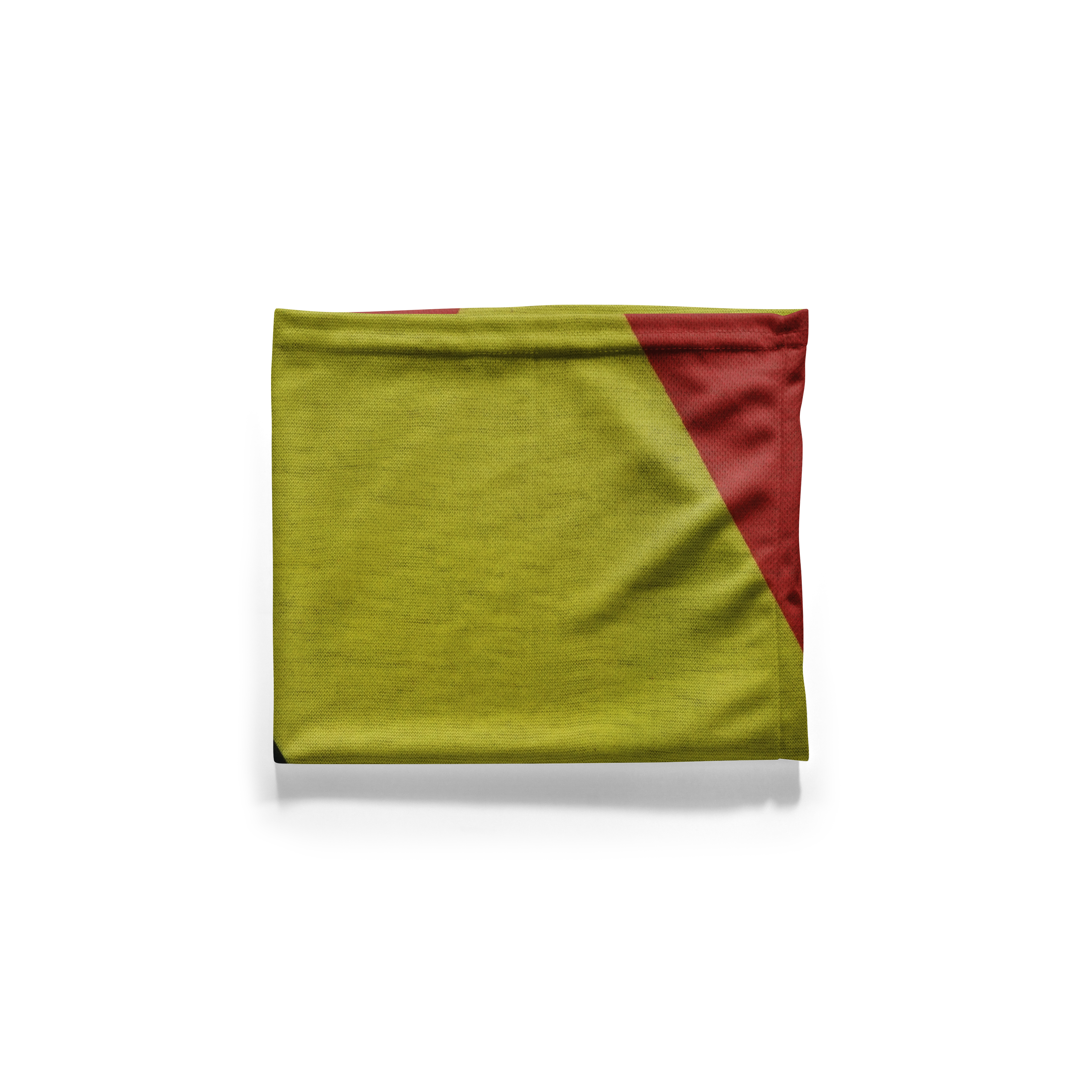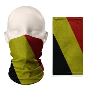 This Belgium-inspired neck gaiter puts a creative spin on the classic tricolor flag. Instead of the traditional vertical bands, the black, yellow, and red are rendered in bold diagonal stripes that sweep across the fabric—injecting motion and modernity into the timeless design. The yellow dominates the central panel, cutting across the face, while the black anchors the lower left and the red ignites the upper right.