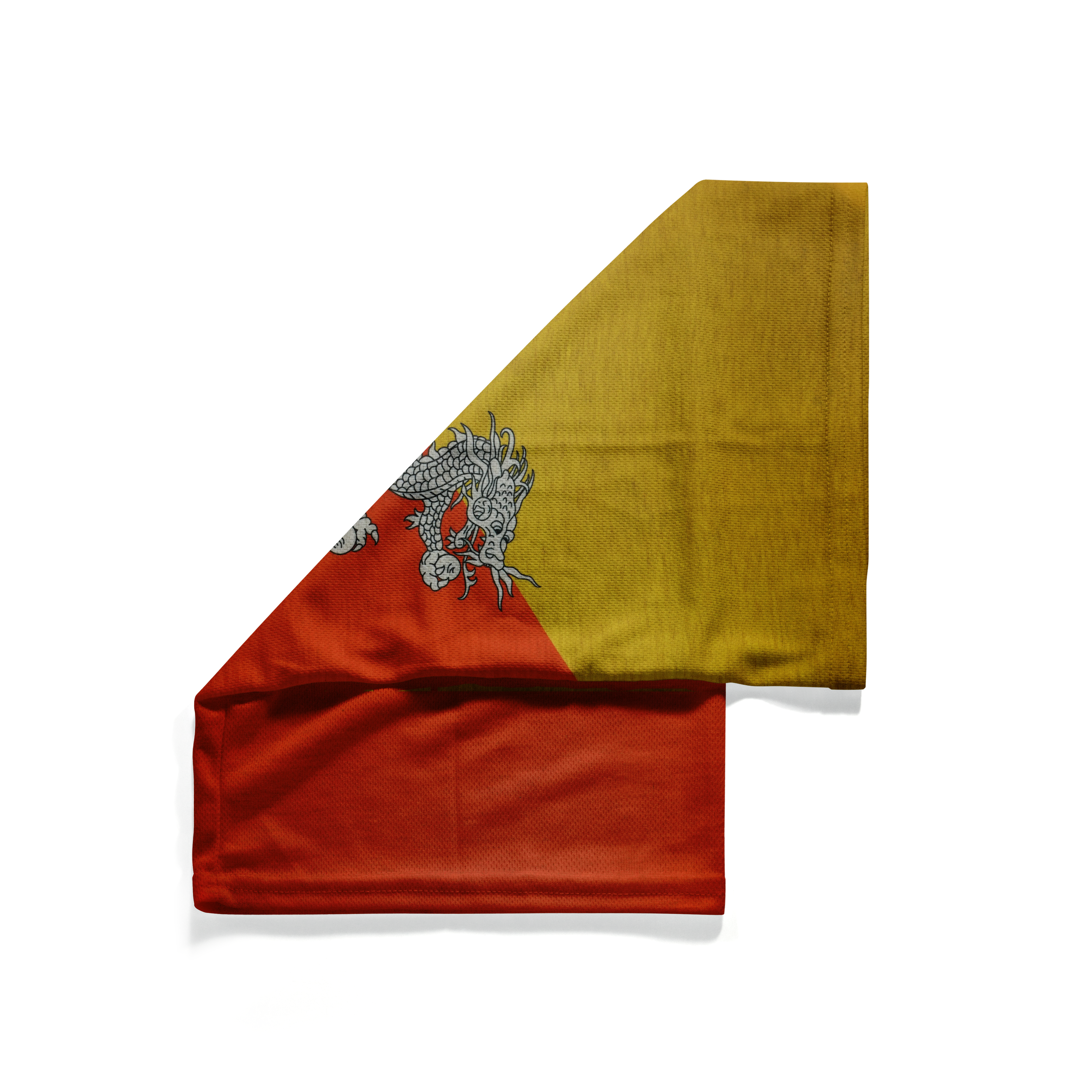 This stunning Bhutan-inspired neck gaiter is a wearable tribute to one of the world's most unique and symbolic flags. Split diagonally from the lower hoist-side corner, the design seamlessly transitions from a warm golden yellow (symbolizing civil tradition and secular authority) to a deep, sacred orange (representing the spiritual tradition of Buddhism). This harmonious duality reflects Bhutan’s cultural and spiritual foundation.