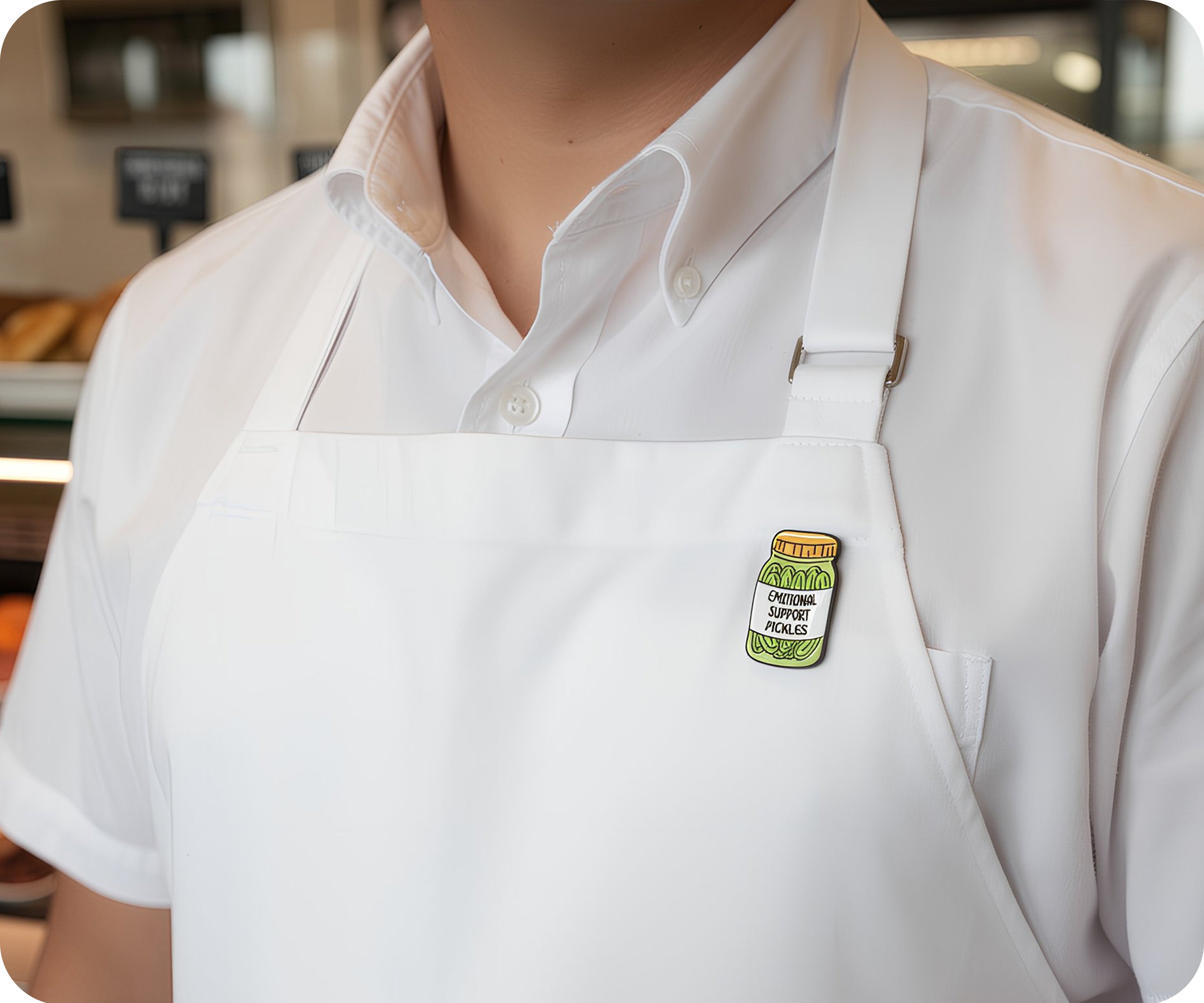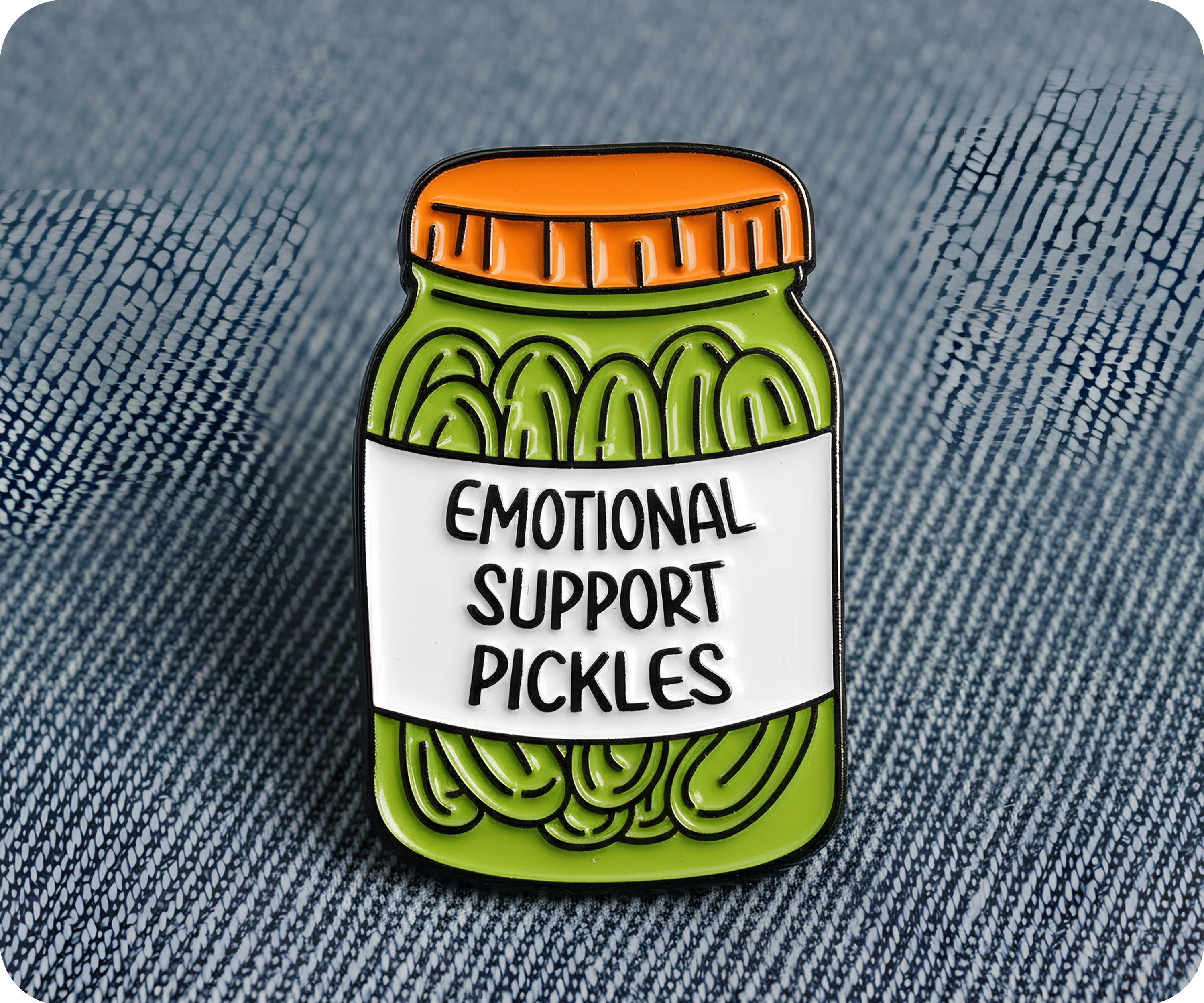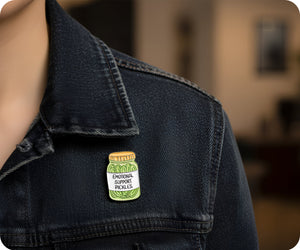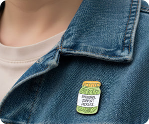 Looking for a quirky and humorous way to show your support? Look no further than our Emotional Support Pickles Jar Pin Badge! This unique and playful accessory is perfect for adding a touch of fun to any outfit. Plus, it's a great conversation starter and will surely bring a smile to anyone's face.