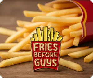 Get your priorities straight with our Fries Before Guys Pin Badge! Show off your love for delicious fries and let everyone know that they come before any guy. Perfect for adding some quirkiness to any outfit or as a playful gift for your foodie friends.