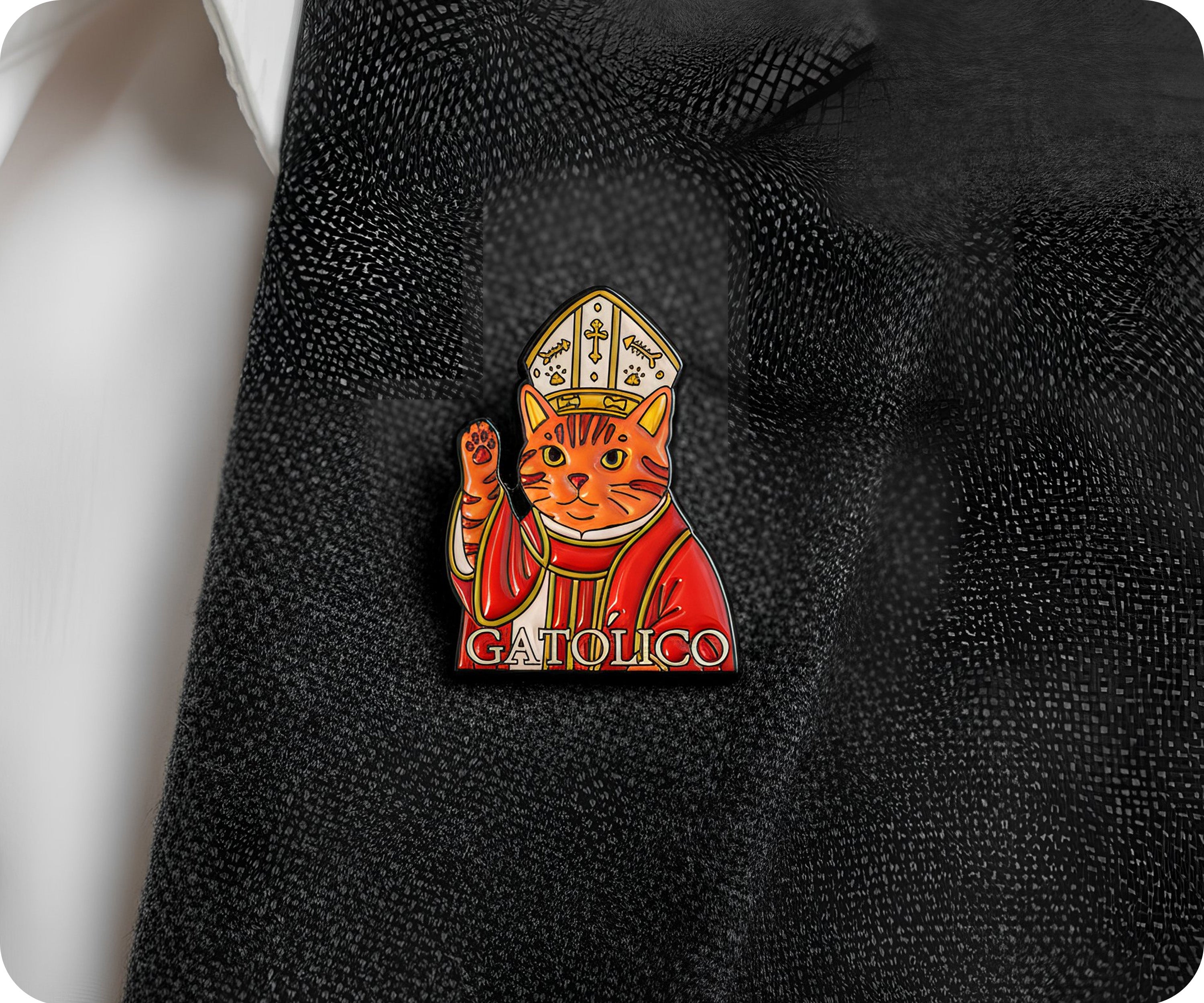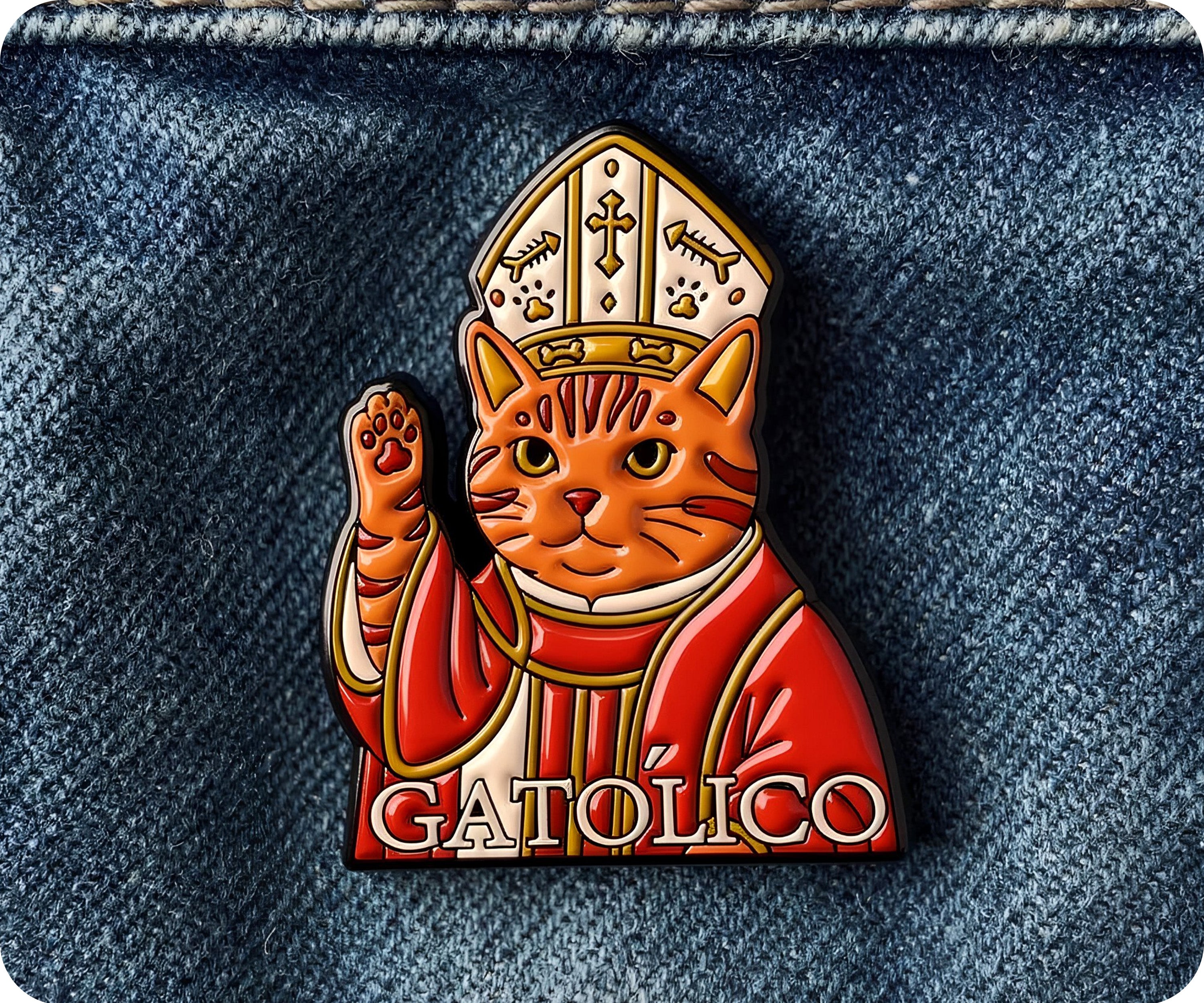 Gatolico Catholic Spanish Pop Cat Pin Badge A purr-fectly hilarious fusion of feline fun and faith! This cheeky pin badge combines the beloved pop culture phenomenon of cats with a playful nod to Catholic culture and Spanish heritage. Ideal for cat lovers, culture enthusiasts, and anyone who appreciates clever wordplay and quirky humour, this accessory is guaranteed to spark smiles and conversations. Clip it to your bag, jacket, or anywhere you want to celebrate the lighter side of life. Small badge, infinite charm!