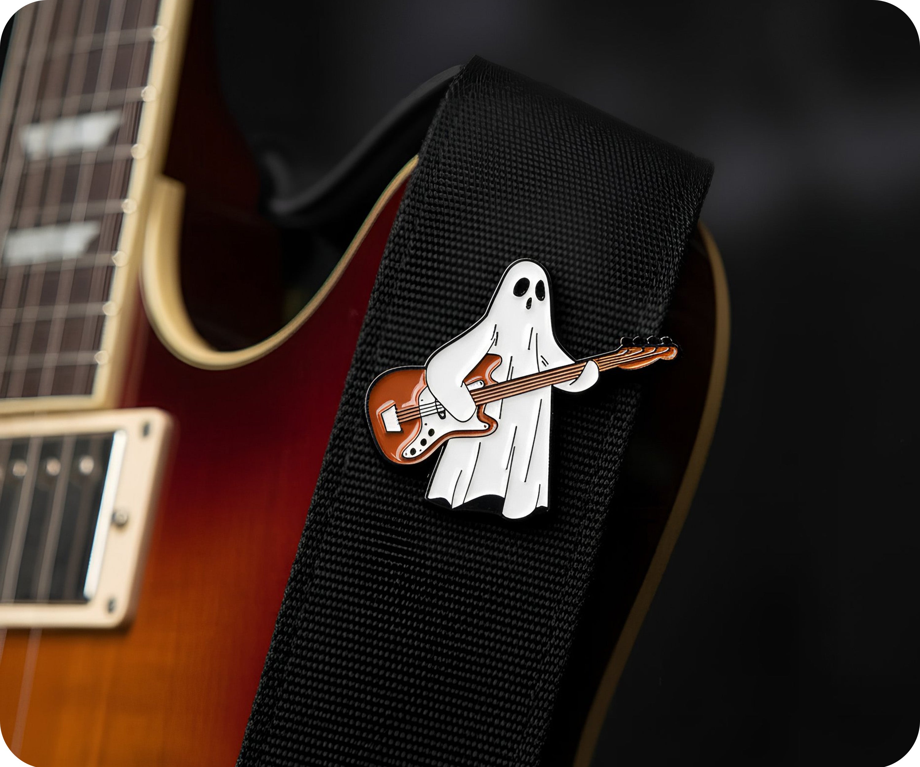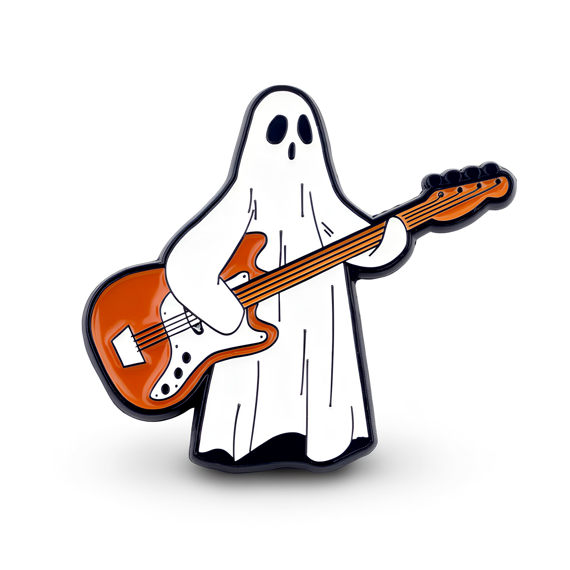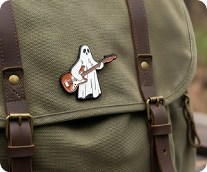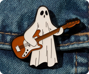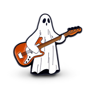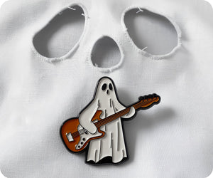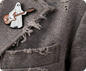 Unleash your inner ghost rockstar with this Guitar Pin Badge. Channel your spooky talent into a playful and quirky statement piece. Perfect for any music lover (dead or alive) !