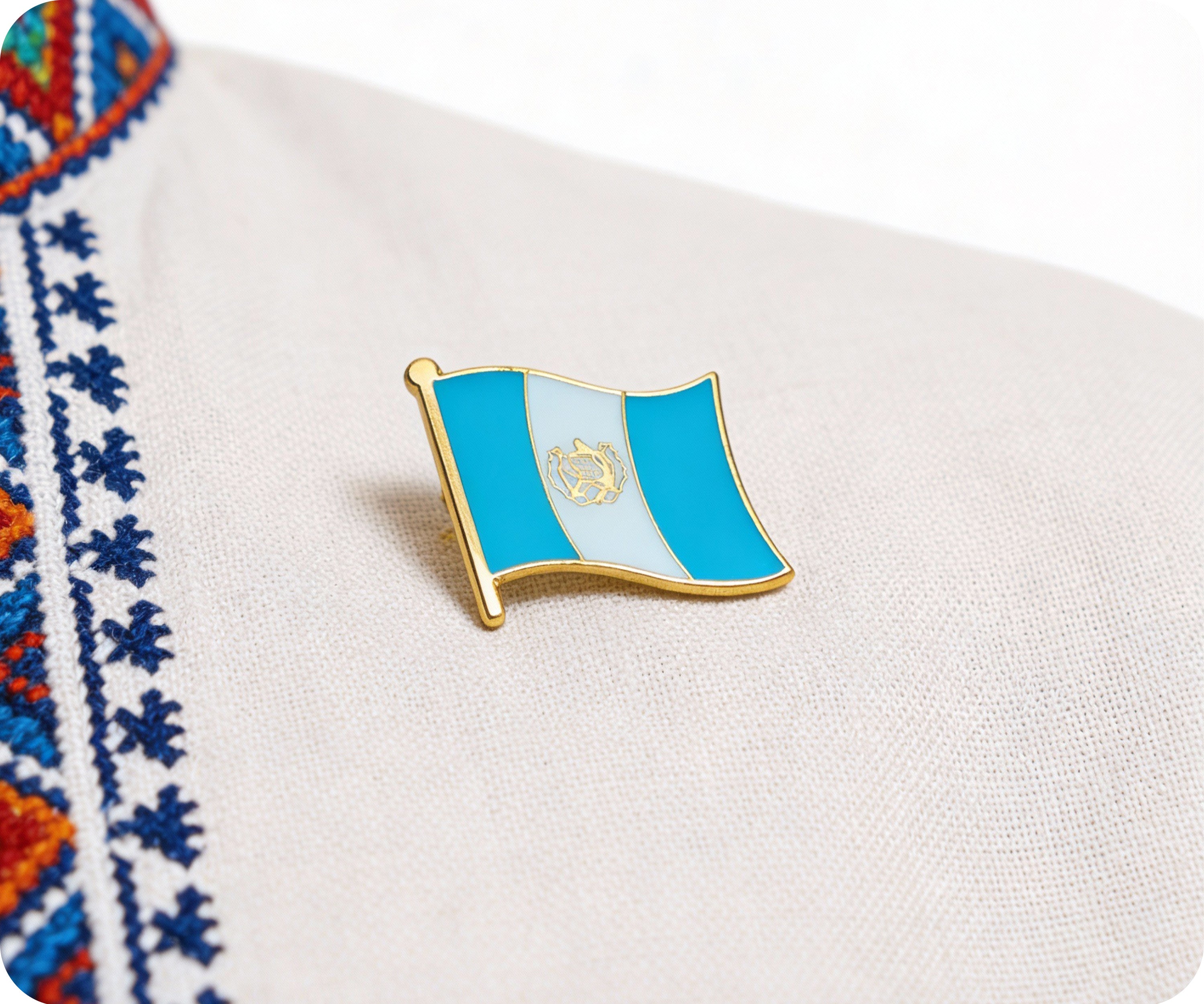 ¡Lleva tu patriotismo con orgullo con nuestro pin con la bandera de Guatemala! Muestra tu amor por Guatemala con este pequeño y peculiar accesorio. Perfecto para cualquier ocasión, este pin seguramente será el tema de conversación. ¡No seas tímido, agrégalo a tu colección hoy mismo! (¡Y al mismo tiempo apoya a nuestra comunidad global!)