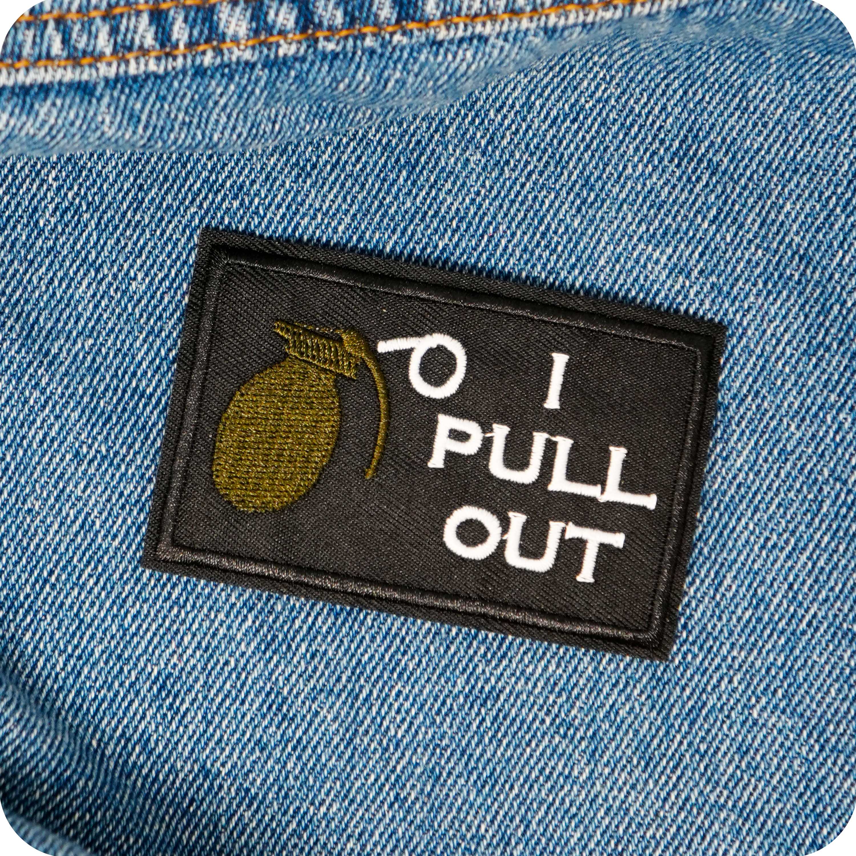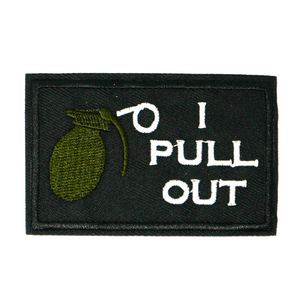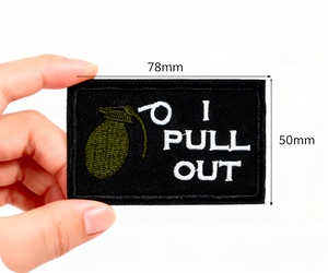 I Pull Out, Grenade Funny Black Iron On Patch (7.8 x 5cm)