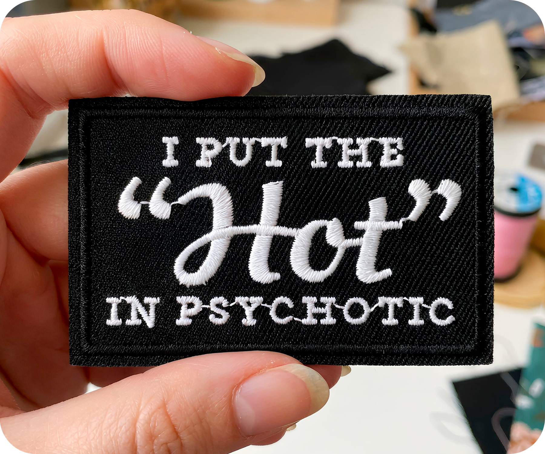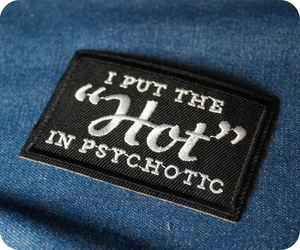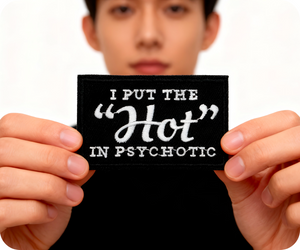 Unleash your bold side with this cheeky "I Put The Hot In Psychotic" patch! This 7.8 x 5cm black iron-on is perfect for anyone with a wicked sense of humour and unapologetic attitude. Stick it on your jacket, backpack, or anywhere you want to make a statement and get a few laughs. Simply heat and press for instant edgy flair. Ideal for rebels, comedians, and anyone who refuses to play it safe.