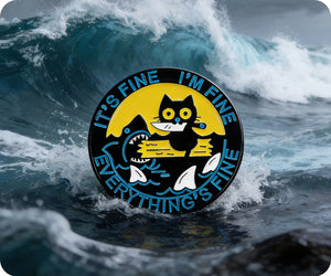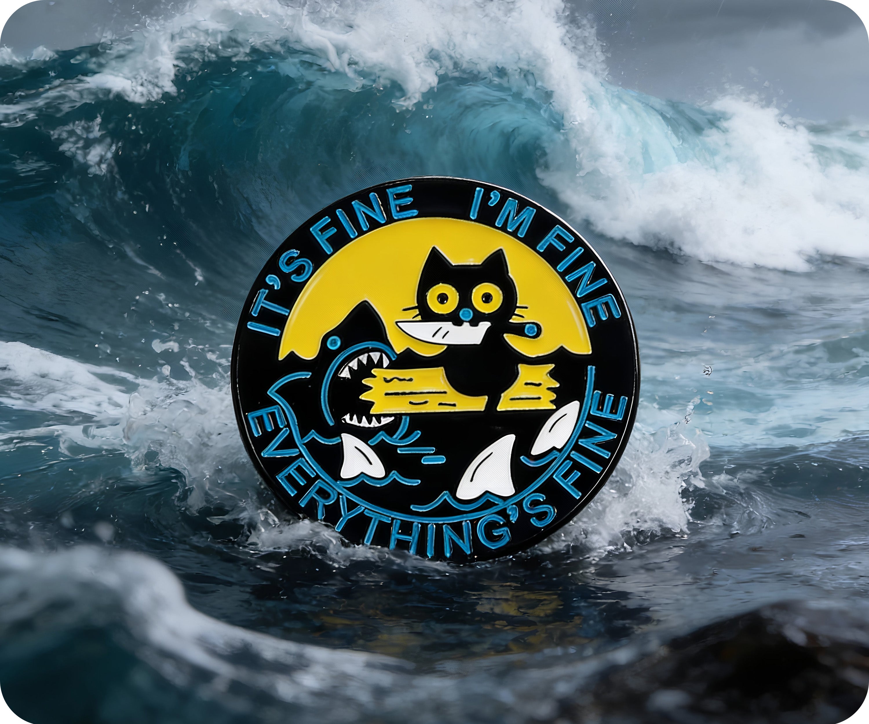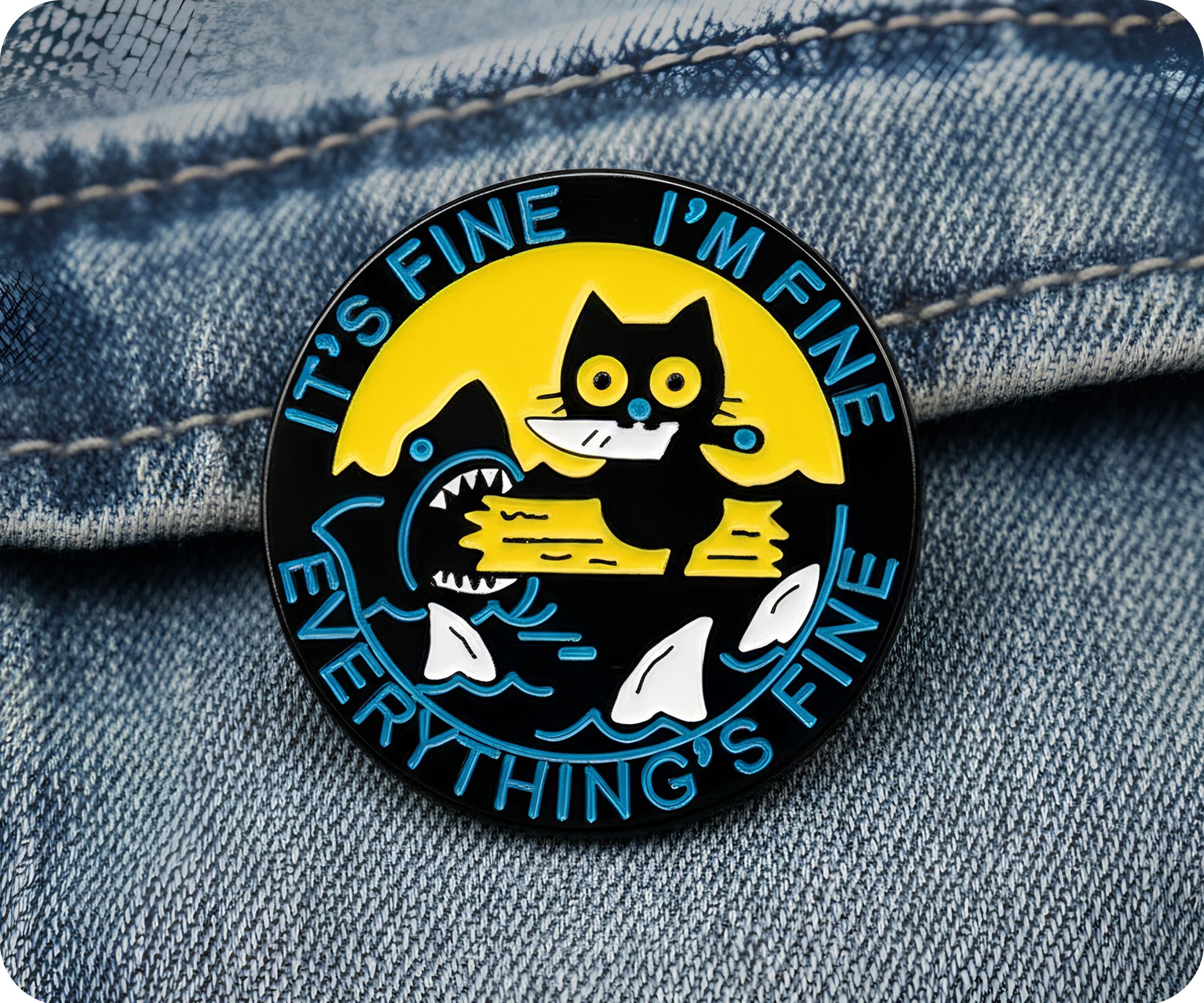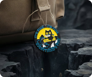 Feeling fine? Show it off with the adorable It's Fine Cat & Shark Everything Fine Pin Badge. Perfect for adding a touch of playfulness to any outfit, this pin features a cool cat and shark combo. So why not let your accessories do the talking and share your fine mood with the world!