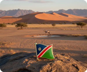 Luce con orgullo tu amor por Namibia con este distintivo con la bandera de diseño exclusivo. Muestra tu lado peculiar y representa a tu país favorito. Perfecto para cualquier ocasión, este accesorio divertido seguramente llamará la atención y generará conversación. ¡Agrégalo a tu colección hoy!
