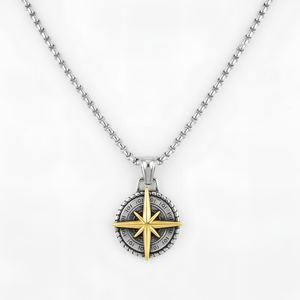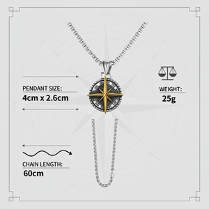 The pendant measures 4.0cm high by 2.6cm wide and hangs from a durable 60cm stainless steel chain, striking the ideal balance between comfort and presence. With a total weight of 25g, it feels substantial yet refined. The intricate compass design is complemented by polished metal detailing, making it suitable for both casual and formal wear.
