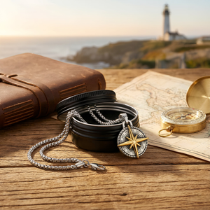Discover your sense of direction with the TIGOLI Nautical Compass Necklace, a bold statement piece that embodies adventure, freedom, and purpose. This two-tone pendant features a detailed compass rose in gold and silver tones, symbolising exploration and guidance — ideal for travellers, sailors, or anyone with a love for the sea. Stylish yet meaningful, it’s a perfect reminder to stay on course in life.