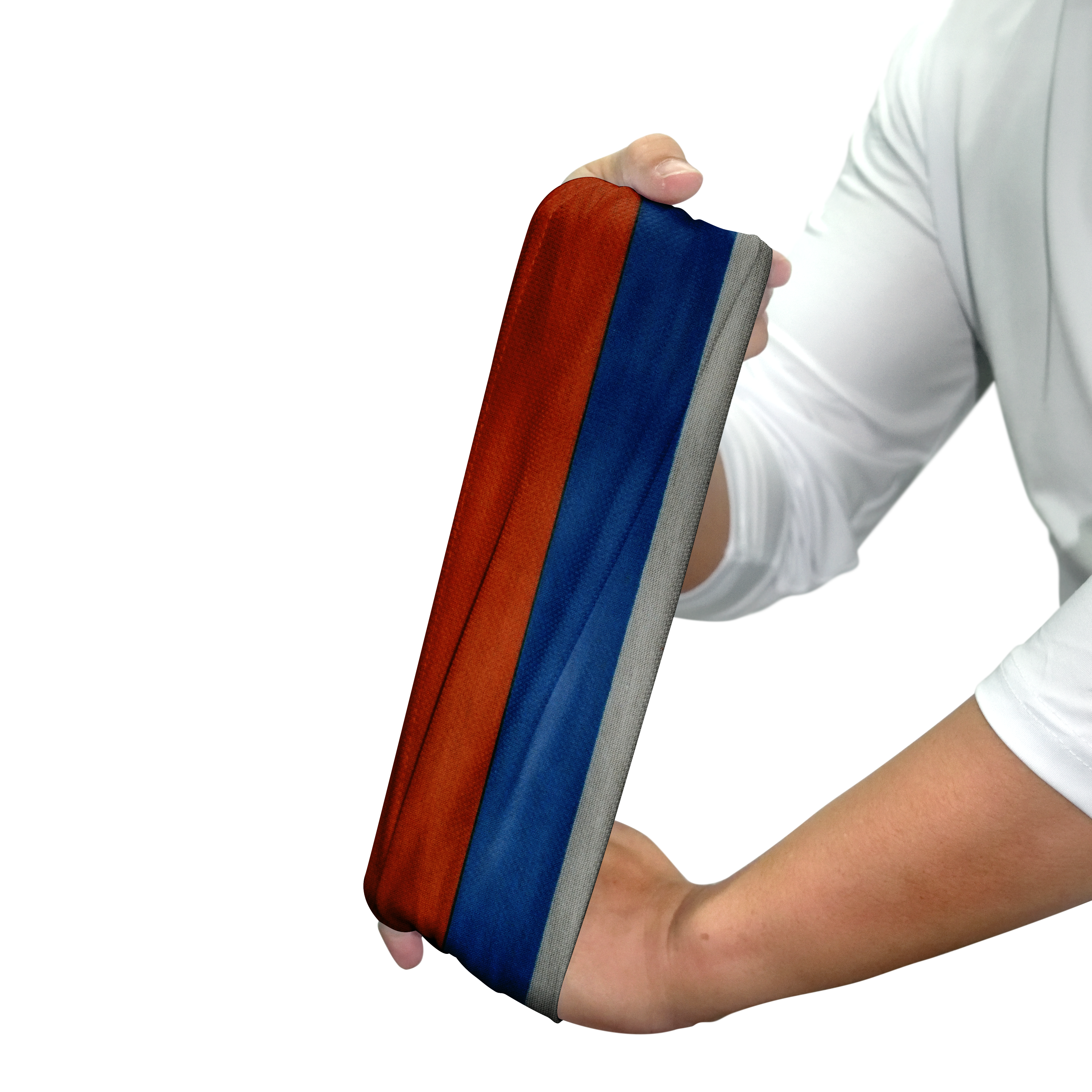 This design cleverly reinterprets the horizontal stripes of the Dutch flag into a compact, centered layout. The traditional red, white, and blue bands are stacked across the middle of the gaiter, bordered by a dominant red-orange field above and below. The shift in proportions gives the flag a contemporary twist while still honoring its iconic tricolor format.
