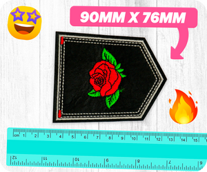Red Rose Bud Flower Shield Black Iron On Patch (9 x 7.6cm)
