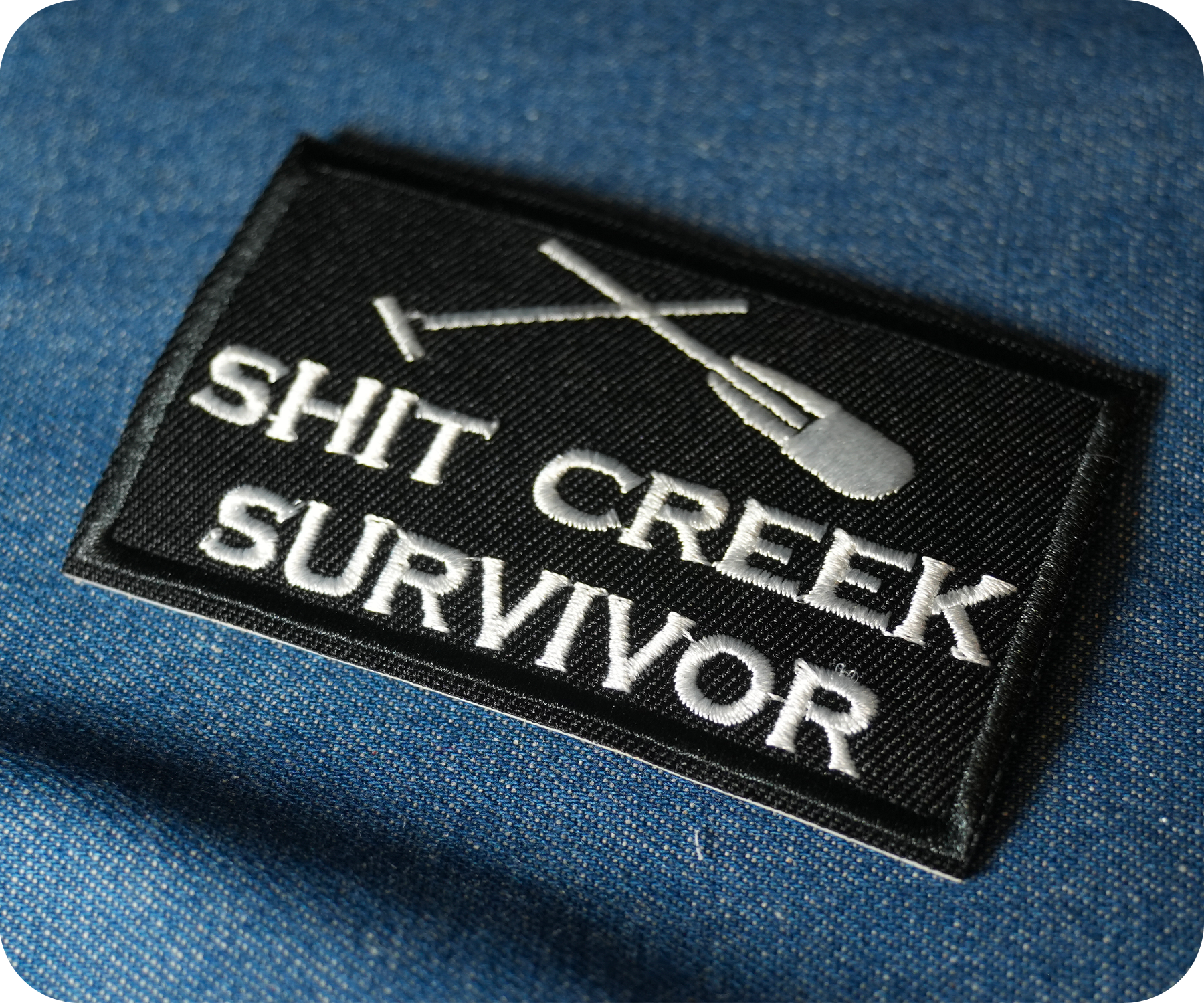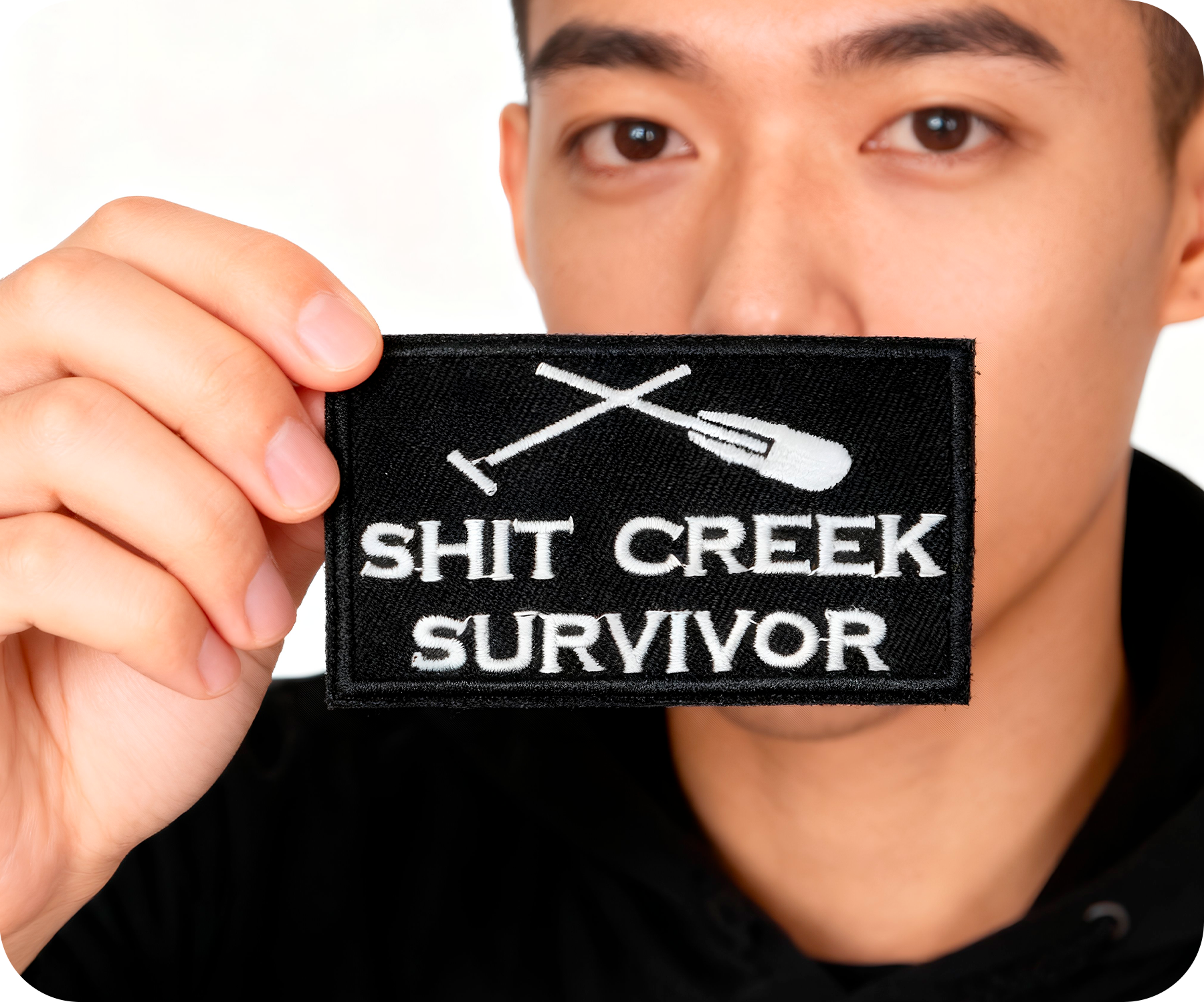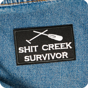 Wear your survival badge with pride using this cheeky "Shit Creeks Survivor" patch! This 7.8 x 5cm black iron-on celebrates making it through life's messiest moments with humour and resilience intact. Perfect for survivors, realists, and anyone who's navigated chaos with a laugh, it's a hilarious badge of honour for jackets, bags, or anywhere you want to broadcast your grit. Simply heat and press for instant application. Because sometimes the best stories come from the worst situations—and you've earned the right to brag about it!