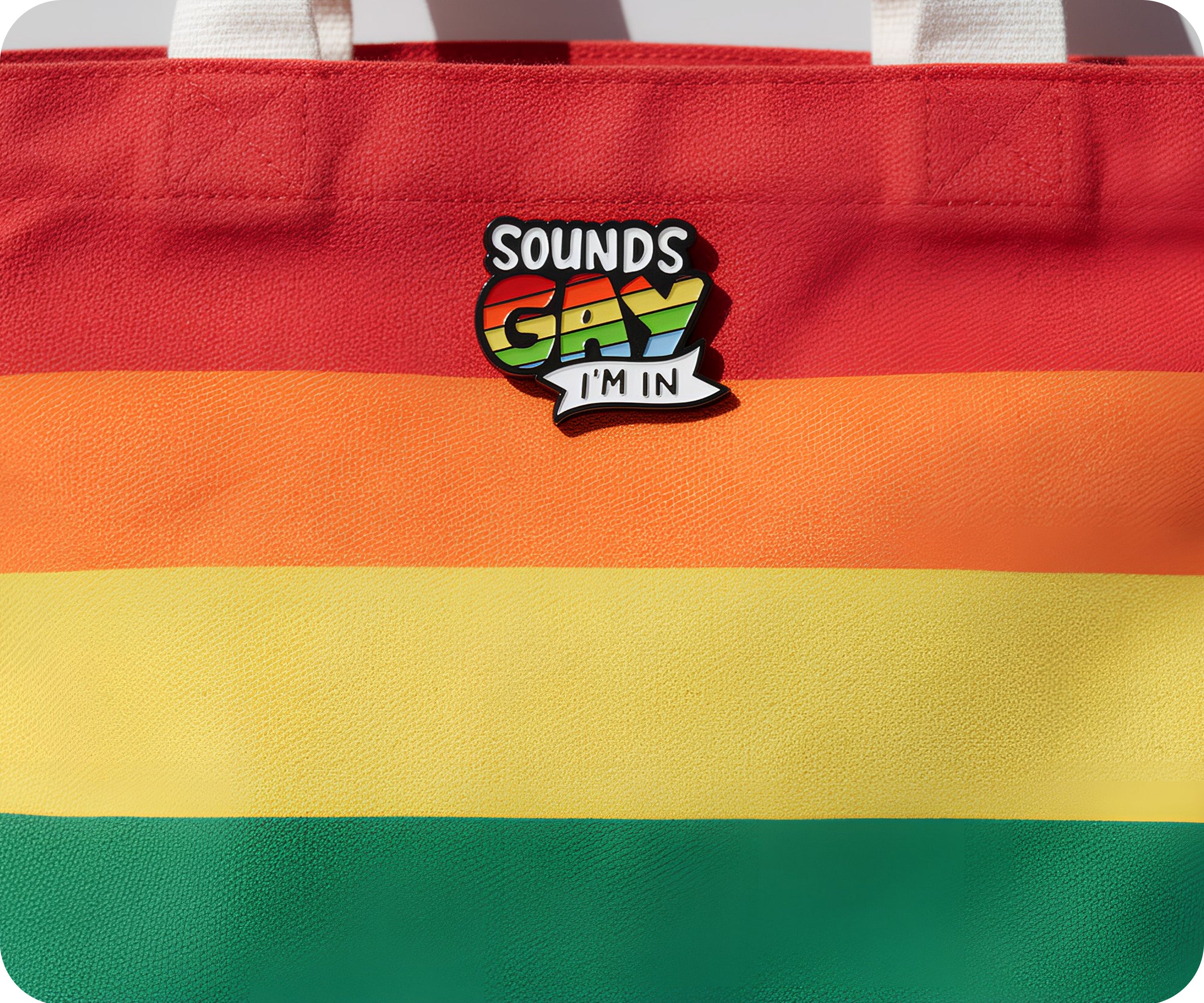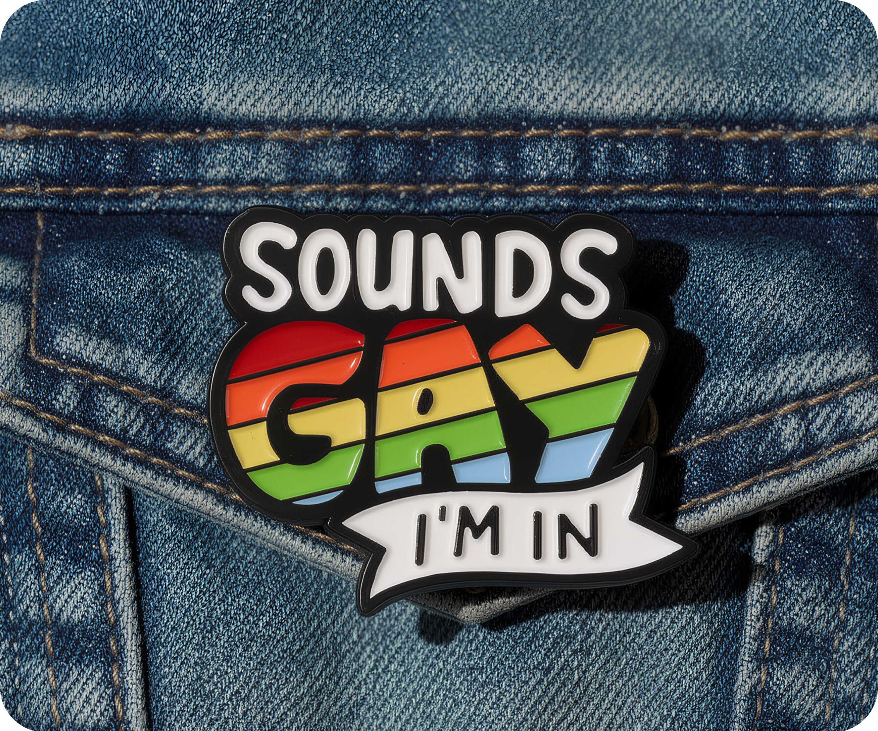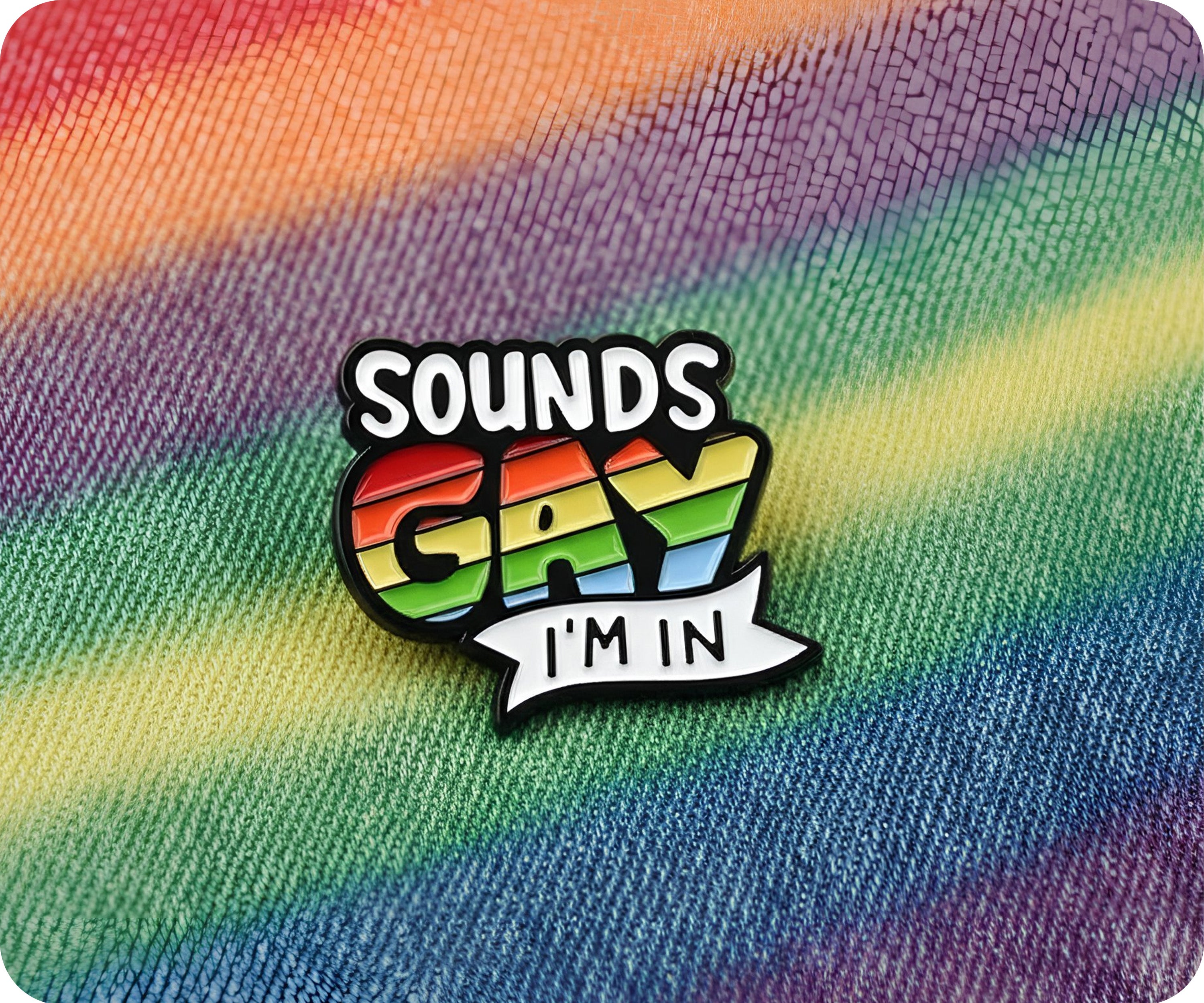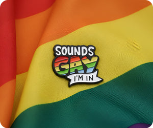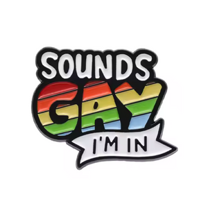 Be out and proud with this Sounds Gay I'm In Pin Badge! Join in on the fun and show off your unique style with this quirky and playful accessory. Express yourself with the double meaning and humor of this pin.