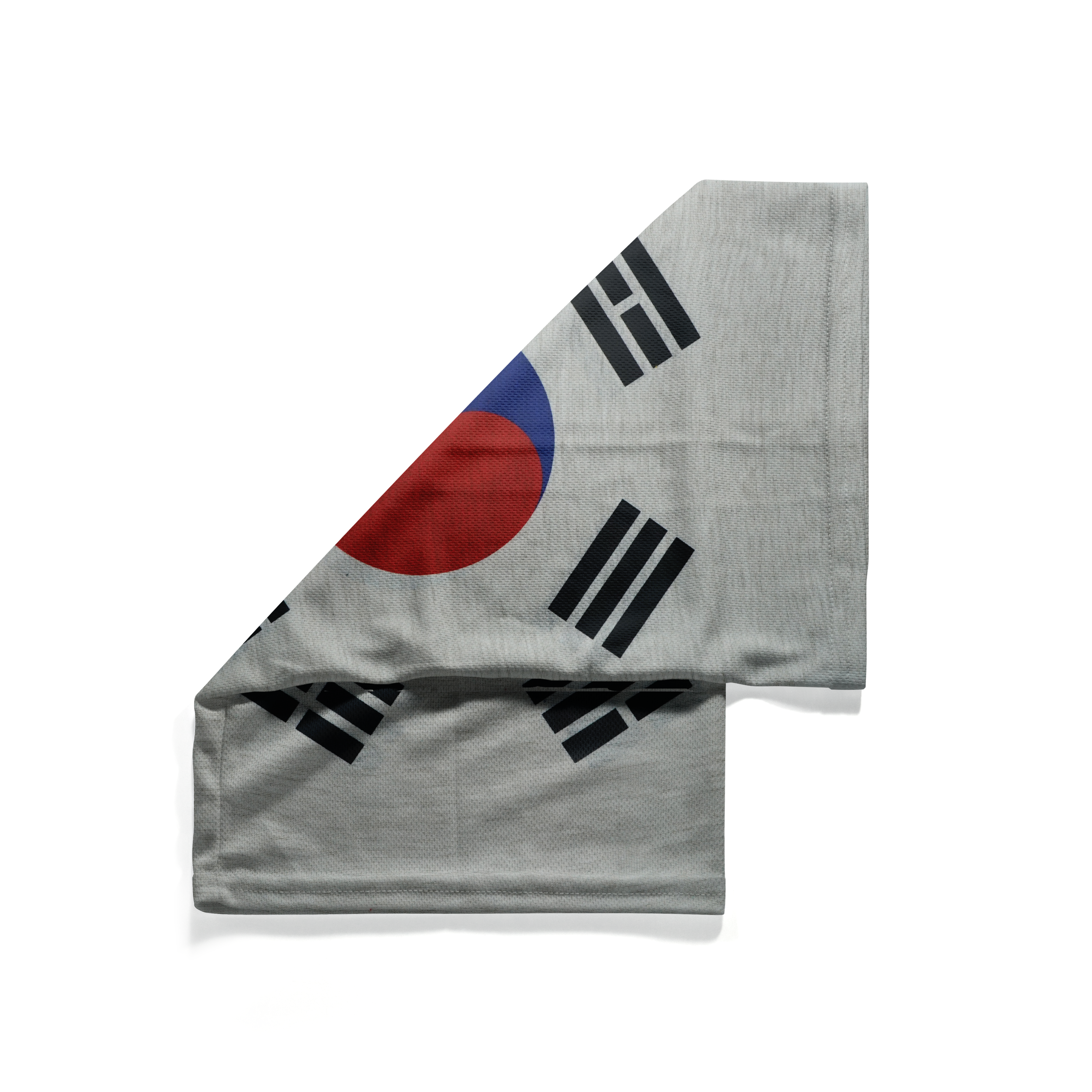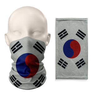 This neck gaiter features the timeless design of the South Korean national flag, also known as the "Taegeukgi," presented with clean symmetry and cultural depth. The backdrop is a soft, muted white, allowing the central red and blue Taegeuk symbol to command attention with its elegant swirl representing balance in the universe—harmony between yin and yang. The vibrant duality of color is bold and meaningful, acting as the visual heart of the design.
