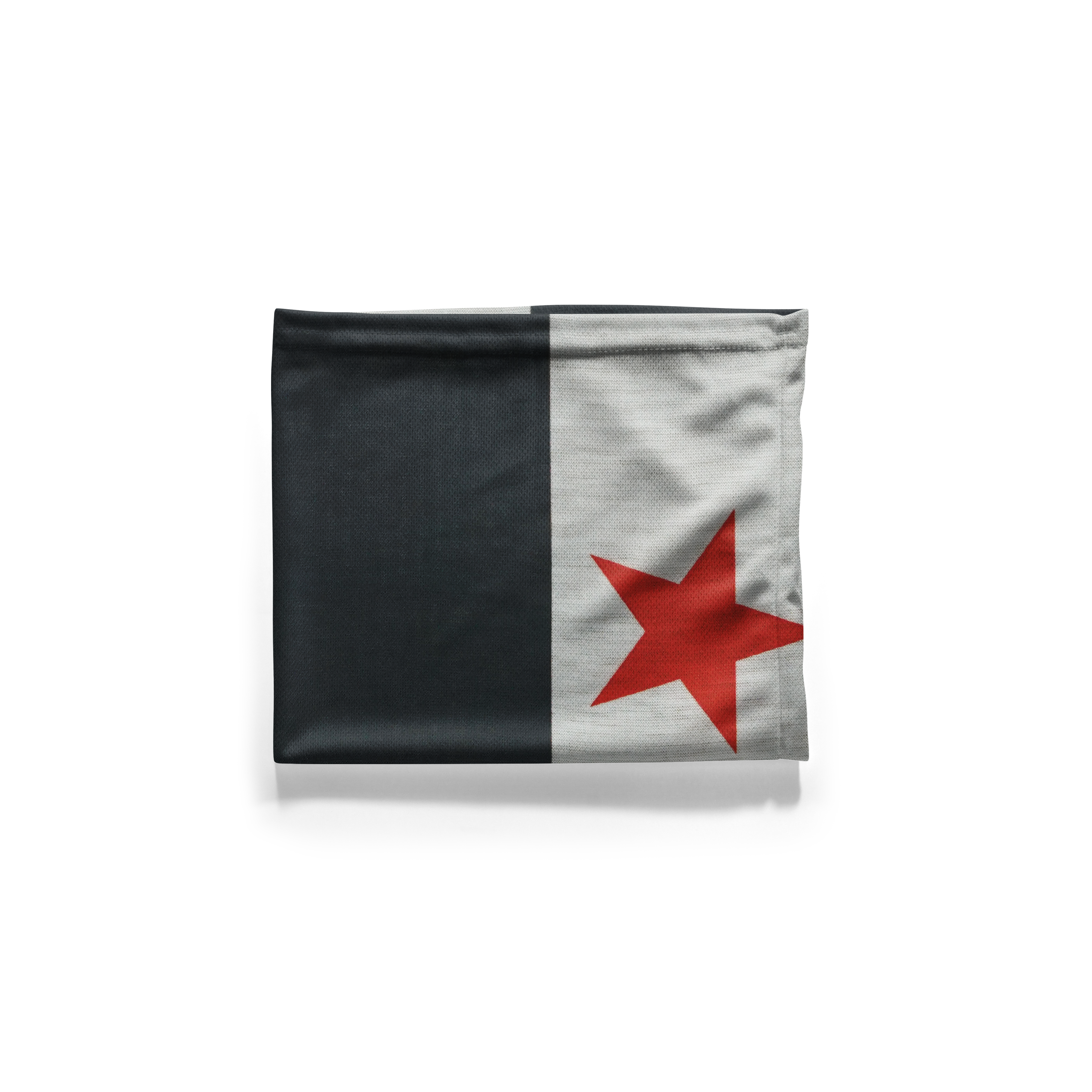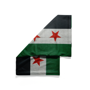 This neck gaiter design features the flag associated with the Syrian opposition, commonly referred to as the "Revolution Flag" or the "Independence Flag." The design consists of three bold vertical stripes in black, white, and green. Prominently placed along the central white stripe are three bright red stars, evenly spaced and symbolic of the people’s struggle, unity, and sacrifice. The deep black stripe to the left represents the nation’s dark past under authoritarian rule, while the vibrant green on the right signifies hope, growth, and a vision for a new future.