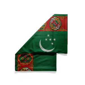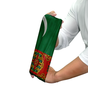 This eye-catching gaiter showcases the vibrant national flag of Turkmenistan, with a design that blends cultural symbolism and modern functionality. Dominated by a deep green field, the right half features a pristine white crescent moon and five stars — representing Islam and the five regions of Turkmenistan — arranged in a distinct arc. The left half is adorned with the country’s signature red vertical stripe, showcasing five richly detailed carpet guls, each symbolizing a historical tribe integral to the nation’s identity.