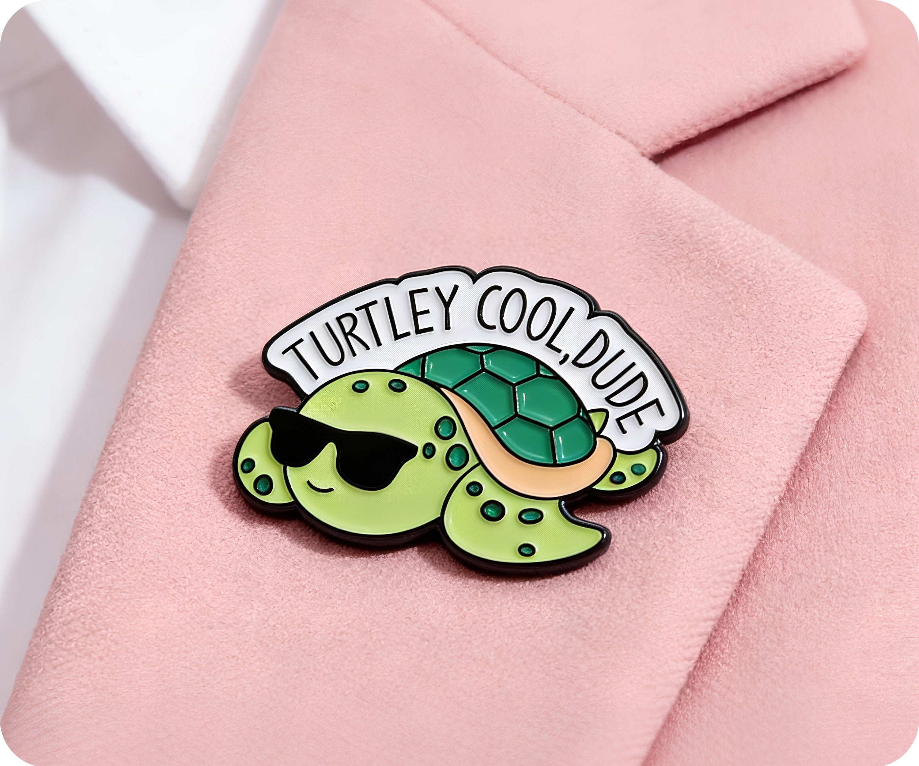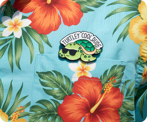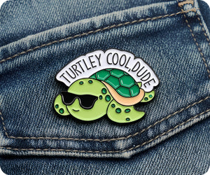 Unleash your inner cool dude with our Turtley Cool Turtle Pin Badge! Show off your unique style and love for turtles with this quirky accessory. Makes for a fun addition to any outfit and a great conversation starter. (Totally rad, right?)
