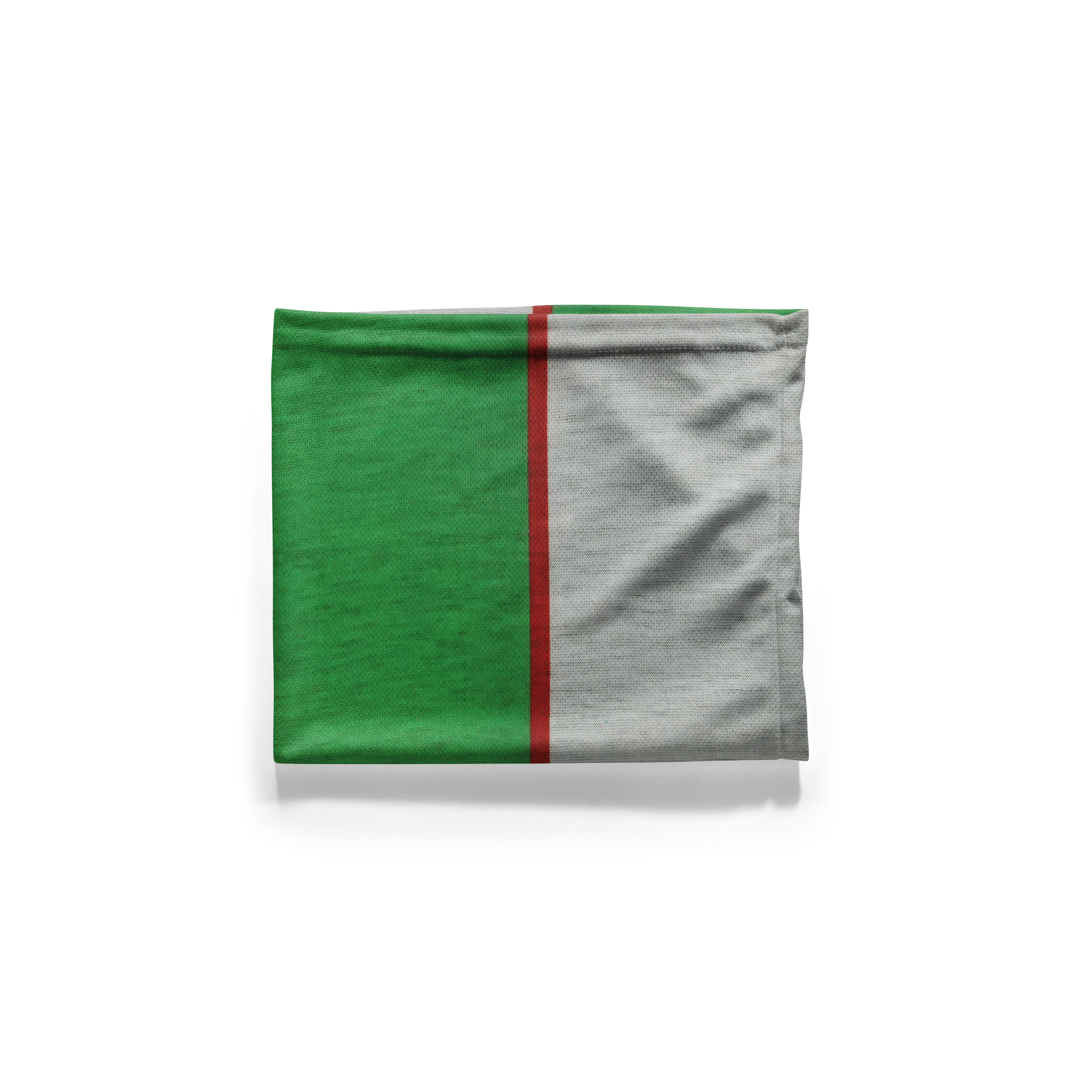 This neck gaiter features a clean, vertically adapted version of the Uzbekistan national flag, wrapping the tricolor seamlessly around the face. The vibrant green, white, and sky blue stripes are bordered by narrow red lines, keeping true to the flag’s original structure while reoriented for wearable symmetry. On the front view, the blue field occupies the right side of the face, crowned by a white crescent moon and twelve stars arranged in distinct rows—symbolizing spiritual purity and the months of the Islamic calendar.