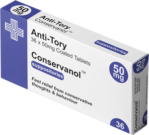 - β Designed with a realistic prescription layout, the Anti-Tory Conservative Pill Medication Box offers a light-hearted take on political affiliations.