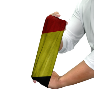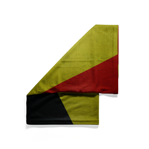 This Belgium-inspired neck gaiter puts a creative spin on the classic tricolor flag. Instead of the traditional vertical bands, the black, yellow, and red are rendered in bold diagonal stripes that sweep across the fabric—injecting motion and modernity into the timeless design. The yellow dominates the central panel, cutting across the face, while the black anchors the lower left and the red ignites the upper right.