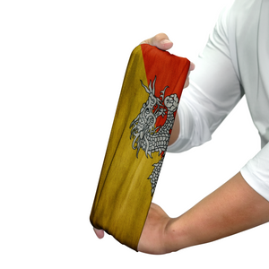 This stunning Bhutan-inspired neck gaiter is a wearable tribute to one of the world's most unique and symbolic flags. Split diagonally from the lower hoist-side corner, the design seamlessly transitions from a warm golden yellow (symbolizing civil tradition and secular authority) to a deep, sacred orange (representing the spiritual tradition of Buddhism). This harmonious duality reflects Bhutan’s cultural and spiritual foundation.