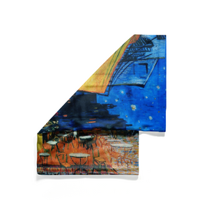 Step into the golden glow of a starry evening with the “Café Terrace at Night” Snood, a wearable tribute to one of Van Gogh’s most inviting scenes. The artwork captures a cozy outdoor café in Arles, illuminated by gaslight under a brilliant indigo sky. Rich yellows and oranges contrast with deep blues and purples to create a dreamy mood that now wraps you in warmth and elegance, day or night.