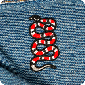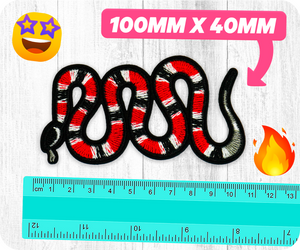 Slither into style with this sleek coral snake iron-on patch! Measuring 10 x 4cm, this elongated design captures the mesmerizing beauty of nature's most iconic serpent in vibrant reds and blacks. Stick it on your jacket, bag, or hat for an instant dose of wild personality. No needle and thread needed—just heat and press to secure. Perfect for reptile enthusiasts, nature lovers, and anyone who dares to embrace their adventurous side. Make a hiss-terical fashion statement today!