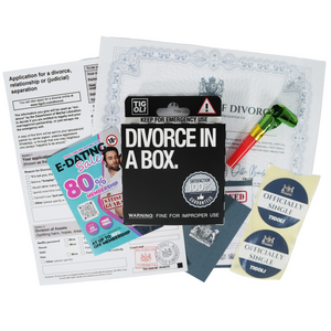 Divorce in a Box – Funny Novelty Gag Gift Set with Divorce Certificate, Application Form, Drinks Voucher, Dating Coupon, Party Horn & Stickers