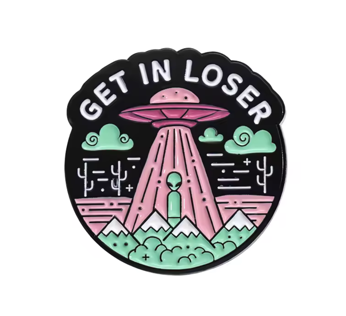 Join the intergalactic gang with our Get In Loser Alien UFO Pin Badge. Display your love for all things otherworldly and add a quirky touch to any outfit. Grab one before they fly away! 🛸