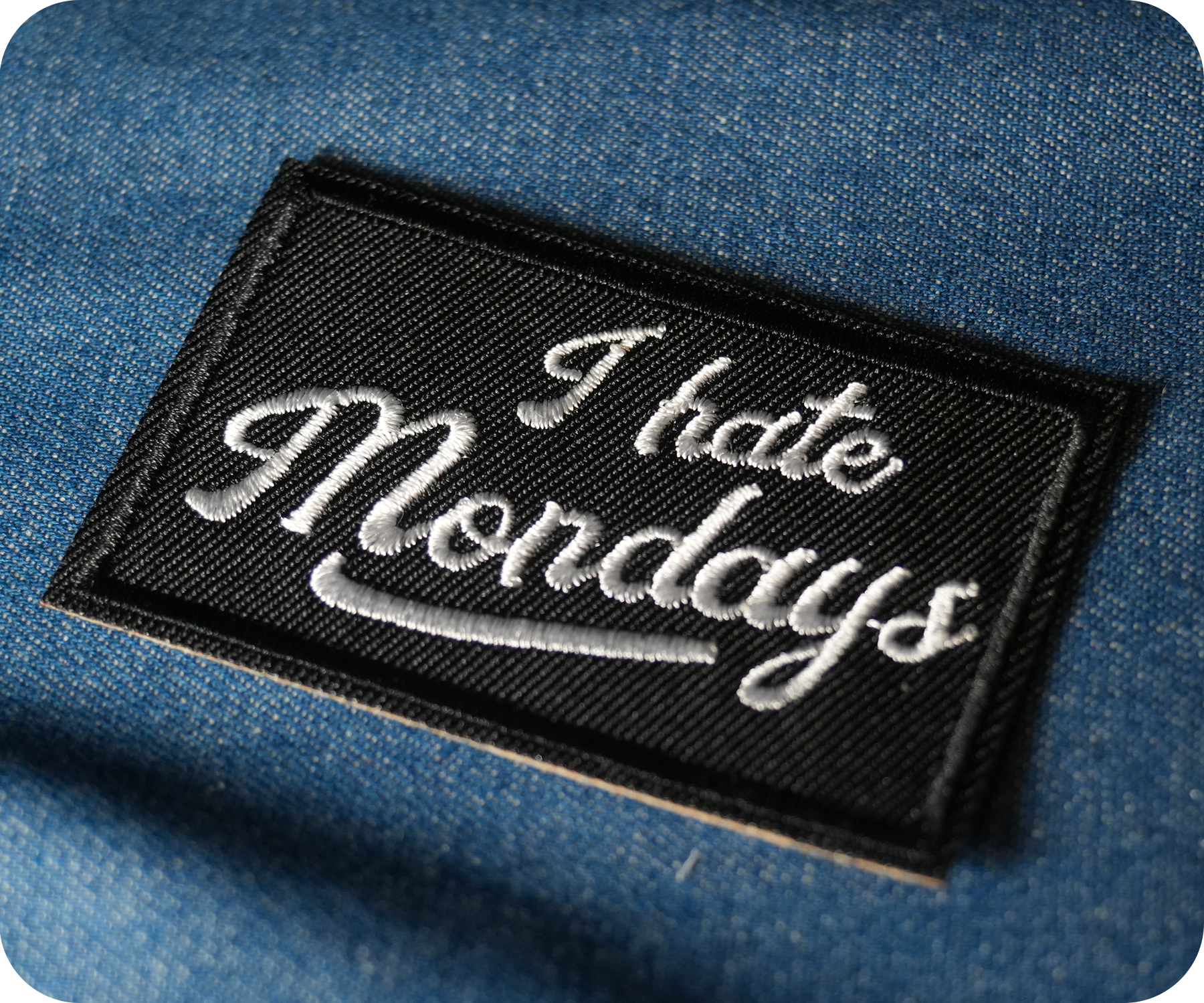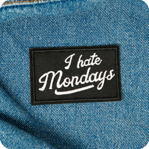 Declare your weekend allegiance with this relatable "I Hate Mondays" patch! At 7.8 x 5cm, this black iron-on captures the universal Monday morning mood in style. Perfect for coffee lovers, night owls, and anyone who counts down to Friday, it's an instant conversation starter. Simply heat and press onto jackets, bags, or hoodies for a humorous touch that speaks volumes. Because sometimes you need to wear your feelings on your sleeve—literally!