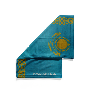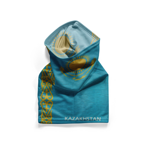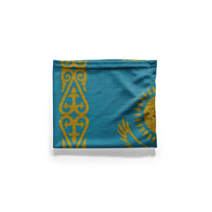 Celebrate the spirit of the steppes with this Kazakhstan Flag Neck Gaiter, adorned with the radiant golden sun, soaring eagle, and traditional "koshkar-muiz" (ram's horns) ornamental motif along the side. The sky-blue background represents peace, freedom, and the wide-open Kazakh skies, while the eagle beneath the sun symbolizes independence and the vision of a free people.