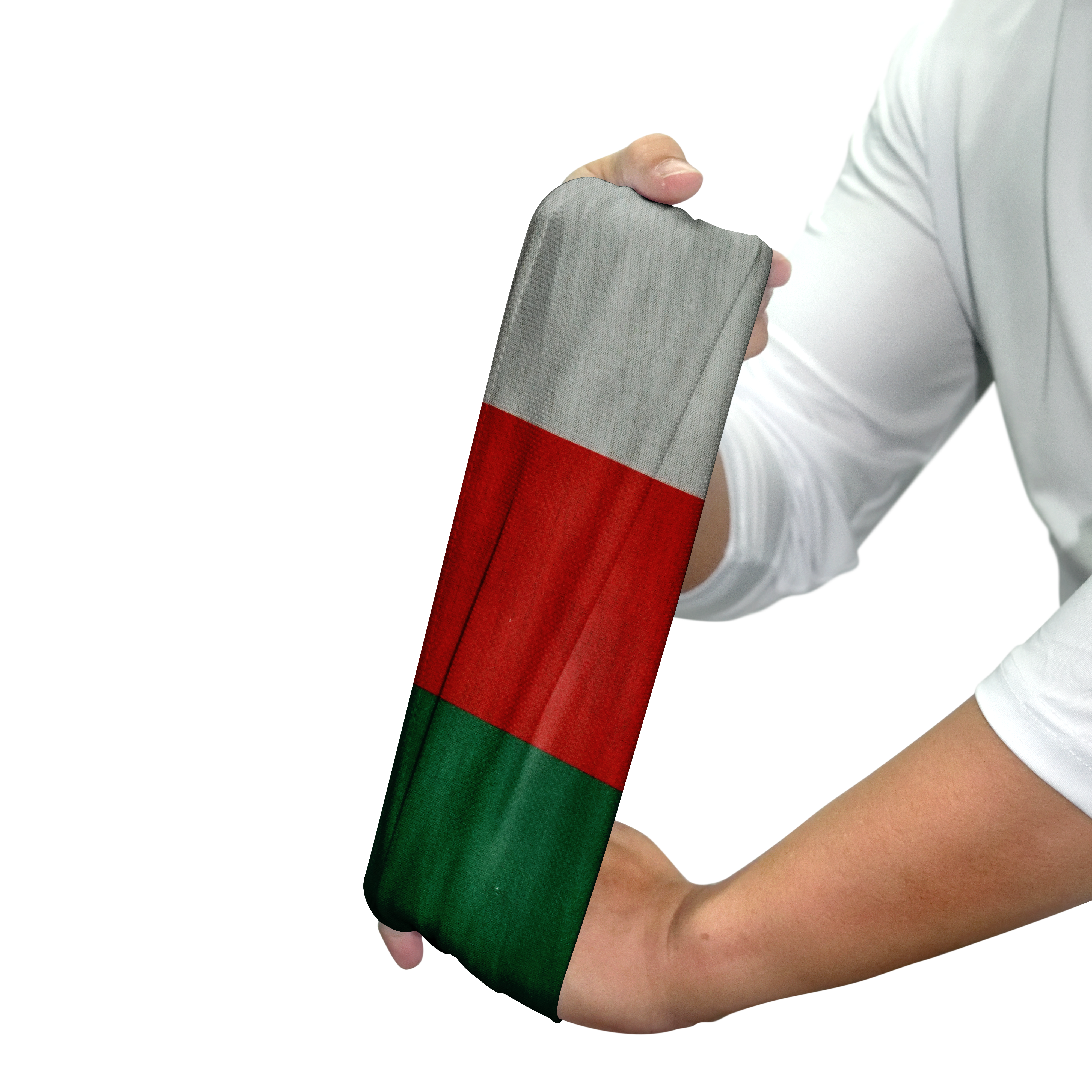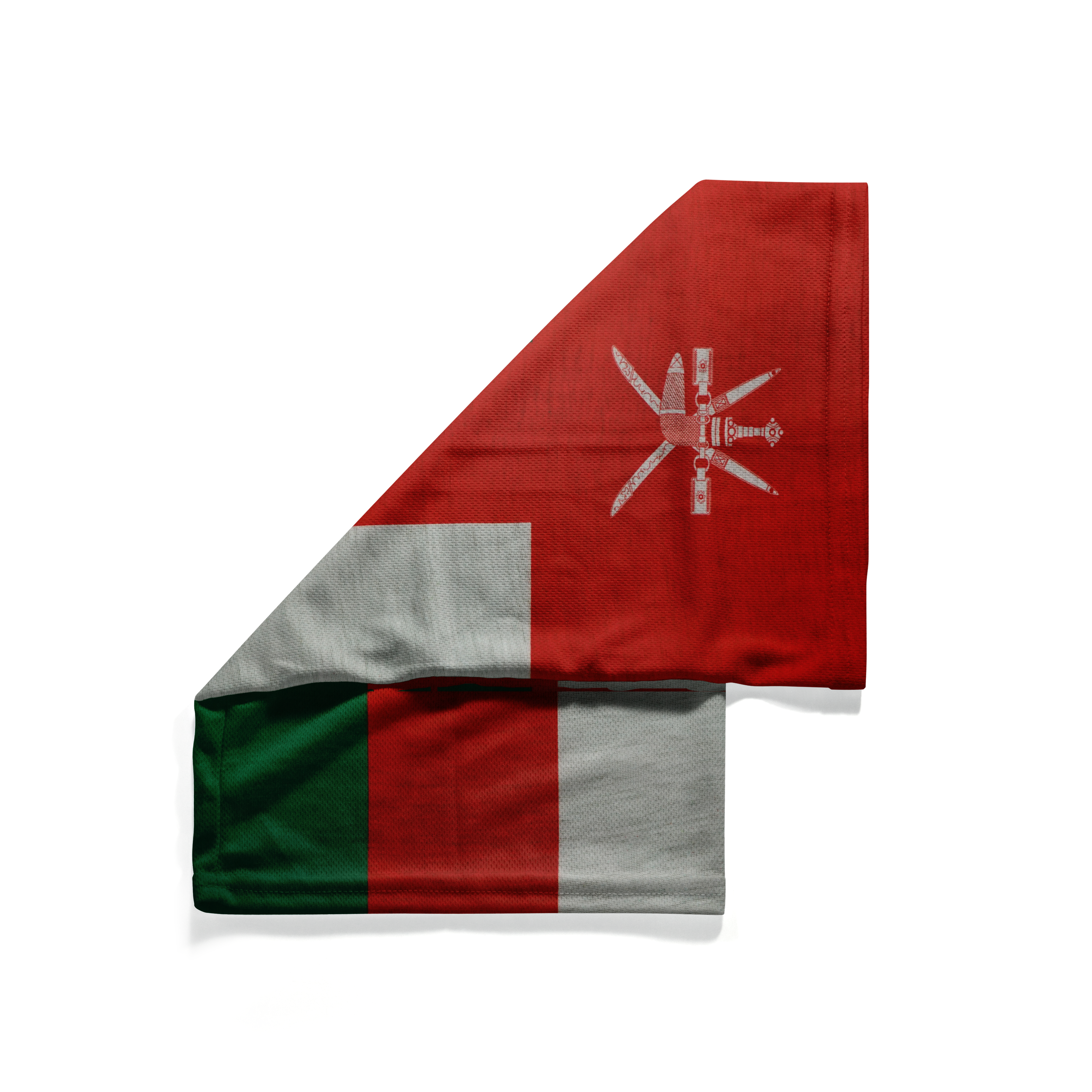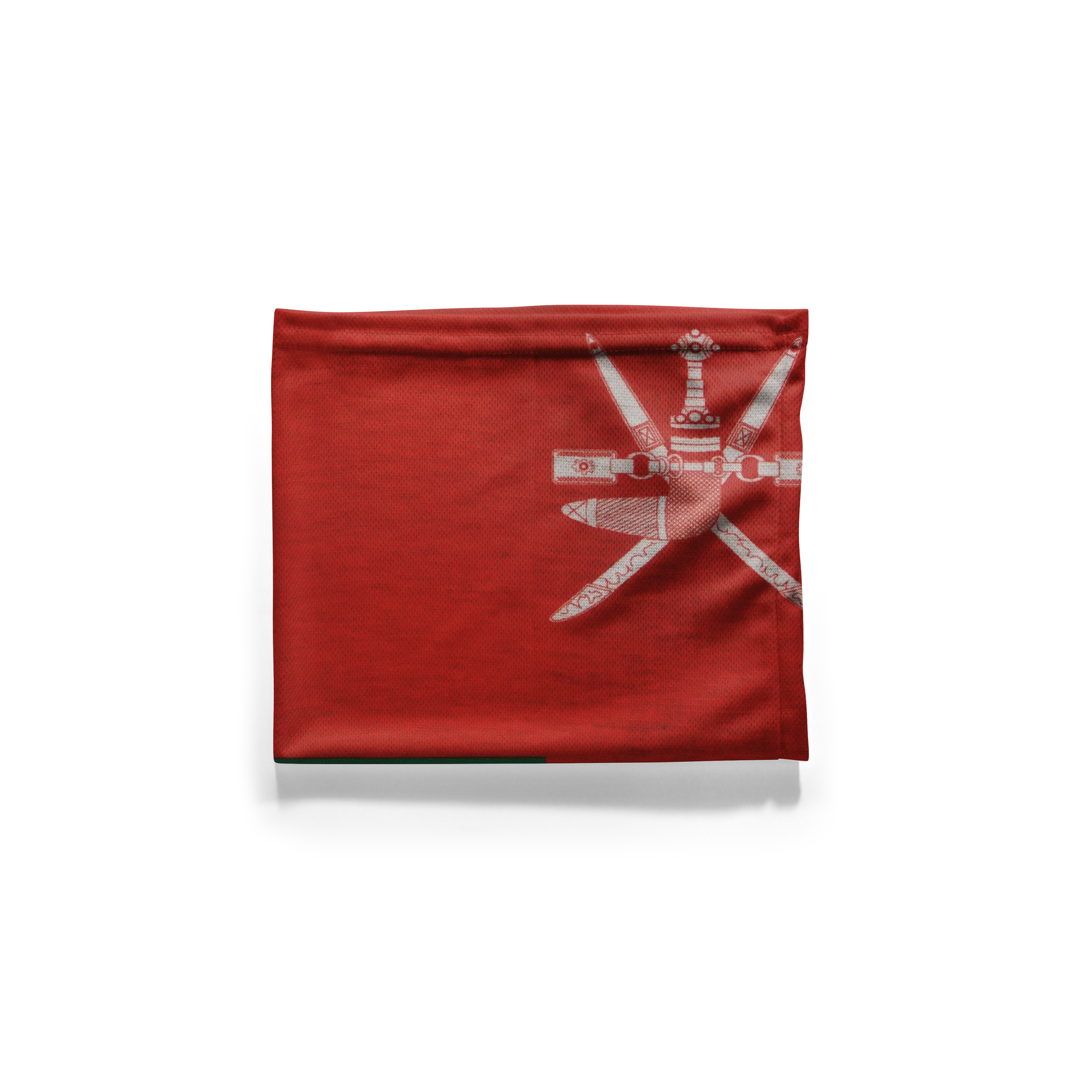 Celebrate the rich heritage and valor of the Sultanate of Oman with this Oman National Flag neck gaiter. Featuring the traditional red, green, and white vertical tricolor design and the iconic Omani Khanjar (dagger) emblem at the top, this versatile accessory honors a nation known for its strength, culture, and history.
