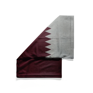 The iconic serrated nine-point design boldly separates the deep maroon field from the white upper half, symbolizing Qatar’s rich historical alliances and its unique status among the Gulf states. This powerful geometric division wraps smoothly across the face and neck, maintaining visual impact whether worn as a face covering, neck scarf, or headband.