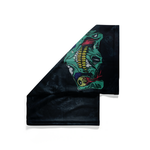 Step into full-on apocalyptic mode with the “Rotface” Snood, an eye-popping, gore-drenched design straight from the pages of a horror graphic novel. With its rotting green flesh, jagged yellow teeth, exposed muscle, and fireball-popped eyeball, this monstrous grin transforms your lower face into something straight out of the undead underworld. Whether it’s Halloween, a horror convention, or just your everyday look, this snood is for the bold and the twisted.
