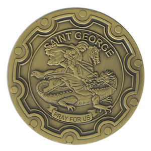 🛡️ Saint George Side – Detailed dragon-slaying imagery with “Pray for Us” inscription