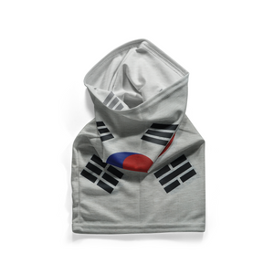 This neck gaiter features the timeless design of the South Korean national flag, also known as the "Taegeukgi," presented with clean symmetry and cultural depth. The backdrop is a soft, muted white, allowing the central red and blue Taegeuk symbol to command attention with its elegant swirl representing balance in the universe—harmony between yin and yang. The vibrant duality of color is bold and meaningful, acting as the visual heart of the design.