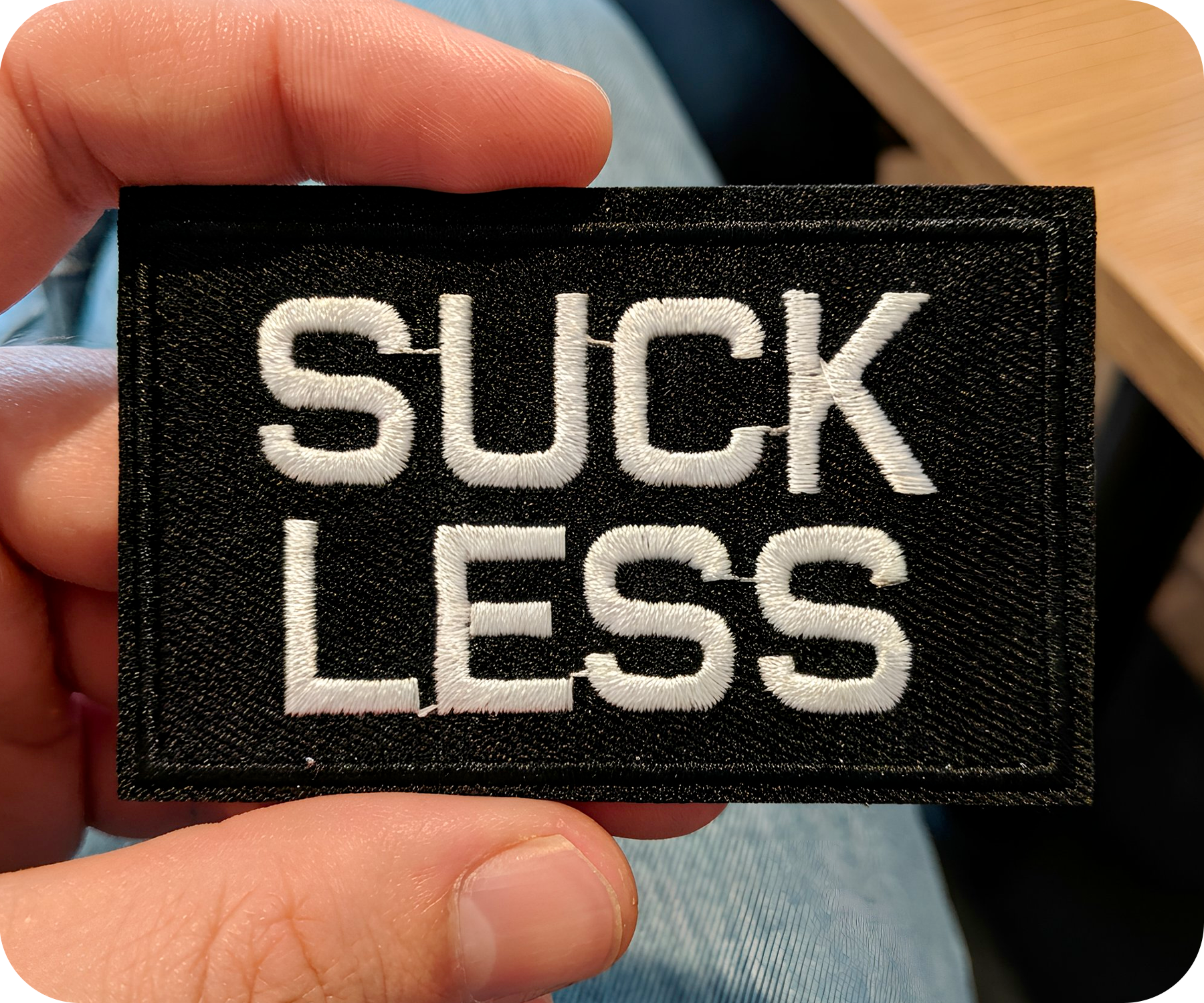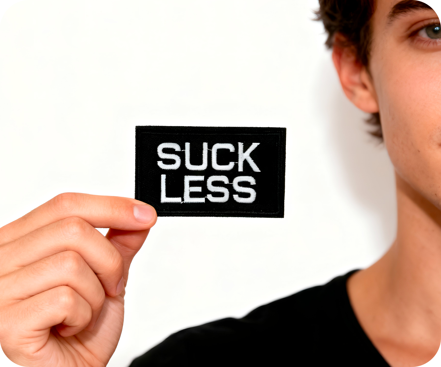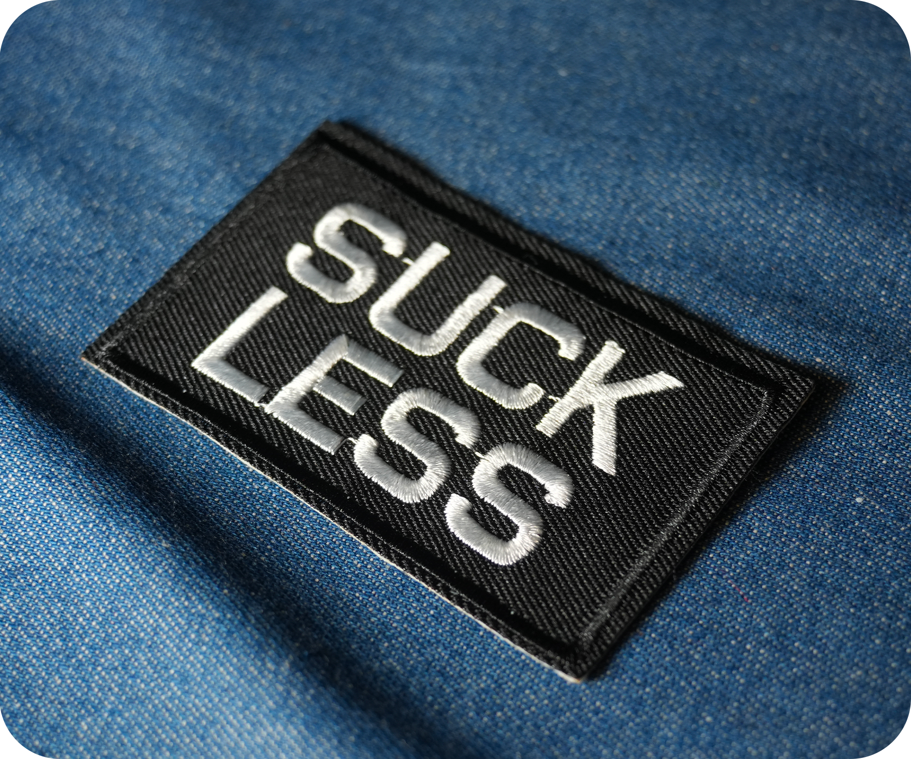 Keep it real with this brutally honest "Suck Less" patch! This 7.8 x 5cm black iron-on delivers motivational wisdom with a refreshingly blunt edge, perfect for realists, gym enthusiasts, and anyone who appreciates no-nonsense attitude. Simply heat and press onto jackets, bags, or hoodies for instant accountability. Whether you're reminding yourself to improve, celebrating self-deprecating humour, or just love straightforward life advice, this patch brings tough-love inspiration that cuts through the motivational fluff. Because sometimes the best encouragement is just telling it like it is!