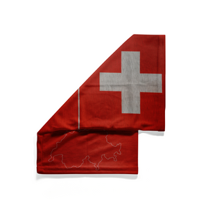 This Switzerland-inspired neck gaiter radiates crisp, iconic simplicity, mirroring the unmistakable design of the Swiss national flag. A bold, white cross sits prominently at the center of a deep red field, symbolizing neutrality, peace, and the country's long-standing humanitarian tradition. The cross, evenly proportioned with thick horizontal and vertical arms, wraps perfectly across the front of the face when worn, making a strong and symmetrical visual impact.