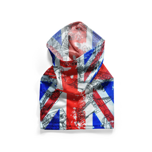 Celebrate British culture in bold style with the Union Jack London Icons Snood, a colorful tribute to the United Kingdom’s capital and its most iconic symbols. Splashed with a distressed red, white, and blue Union Jack, the design is layered with sketched double-decker buses, royal guards, and Big Ben – instantly recognizable emblems of London. This snood is a wearable snapshot of the city’s personality: historic, quirky, and unmistakably proud.
